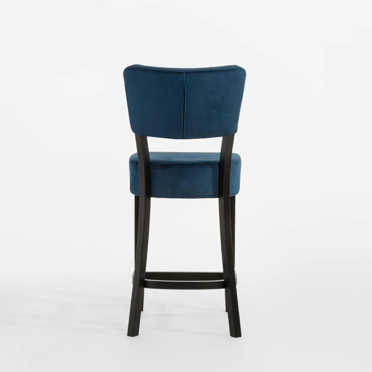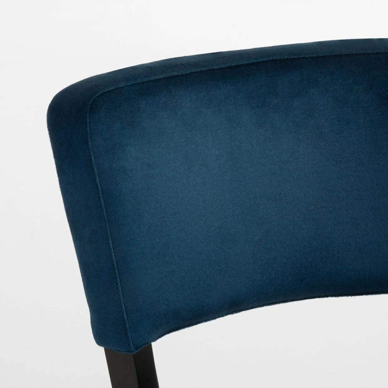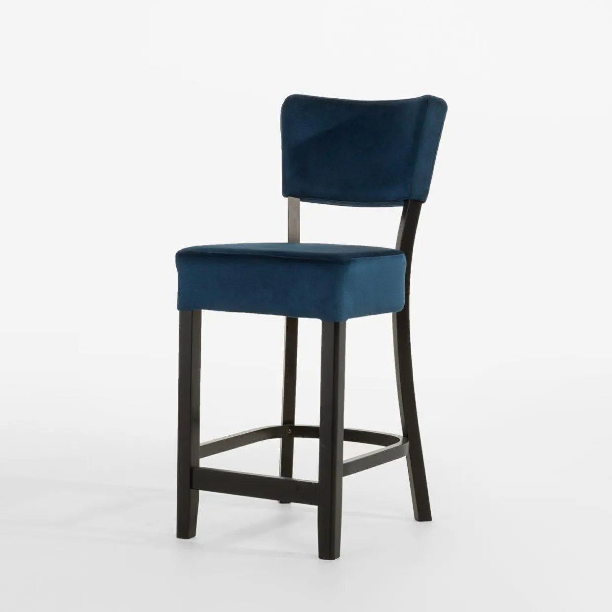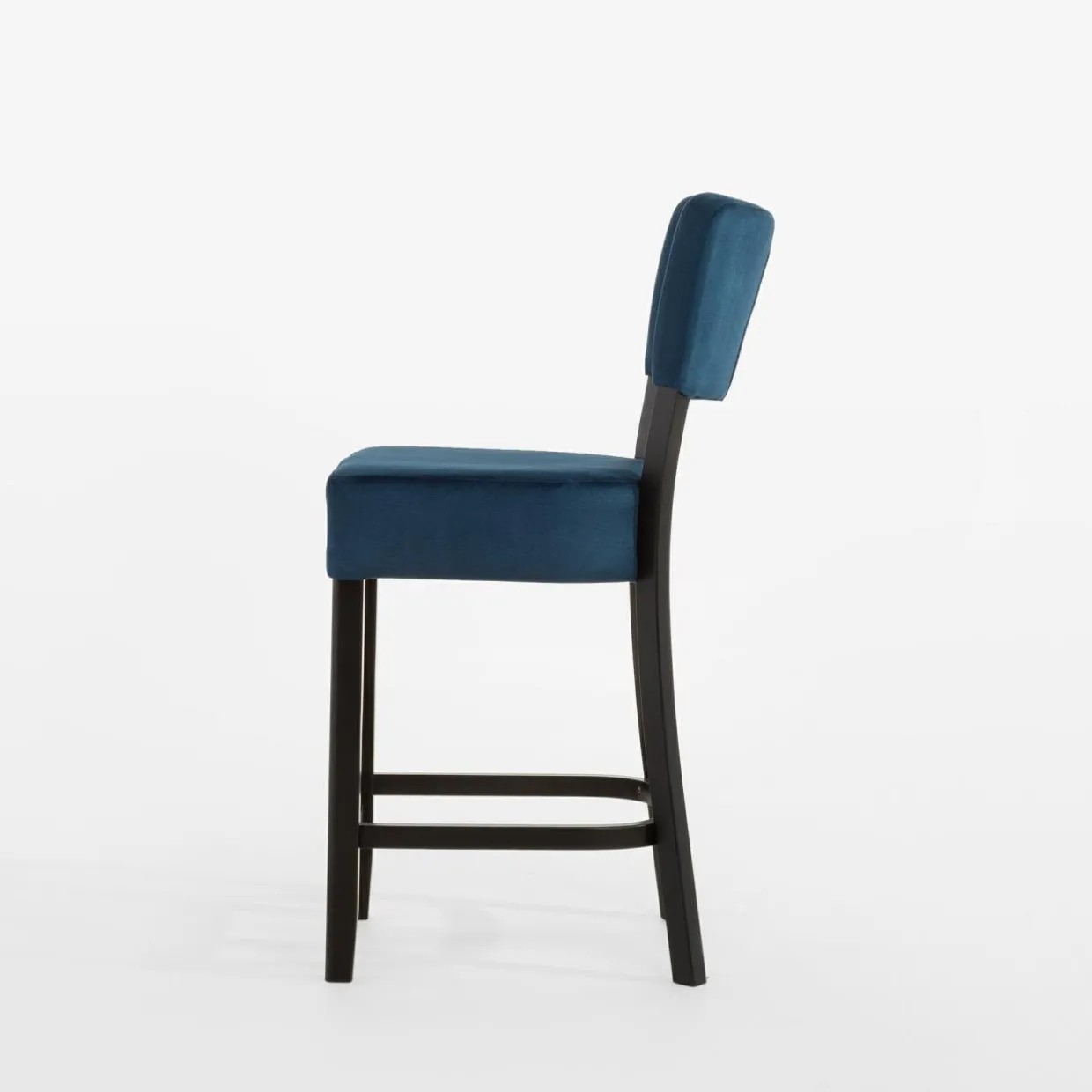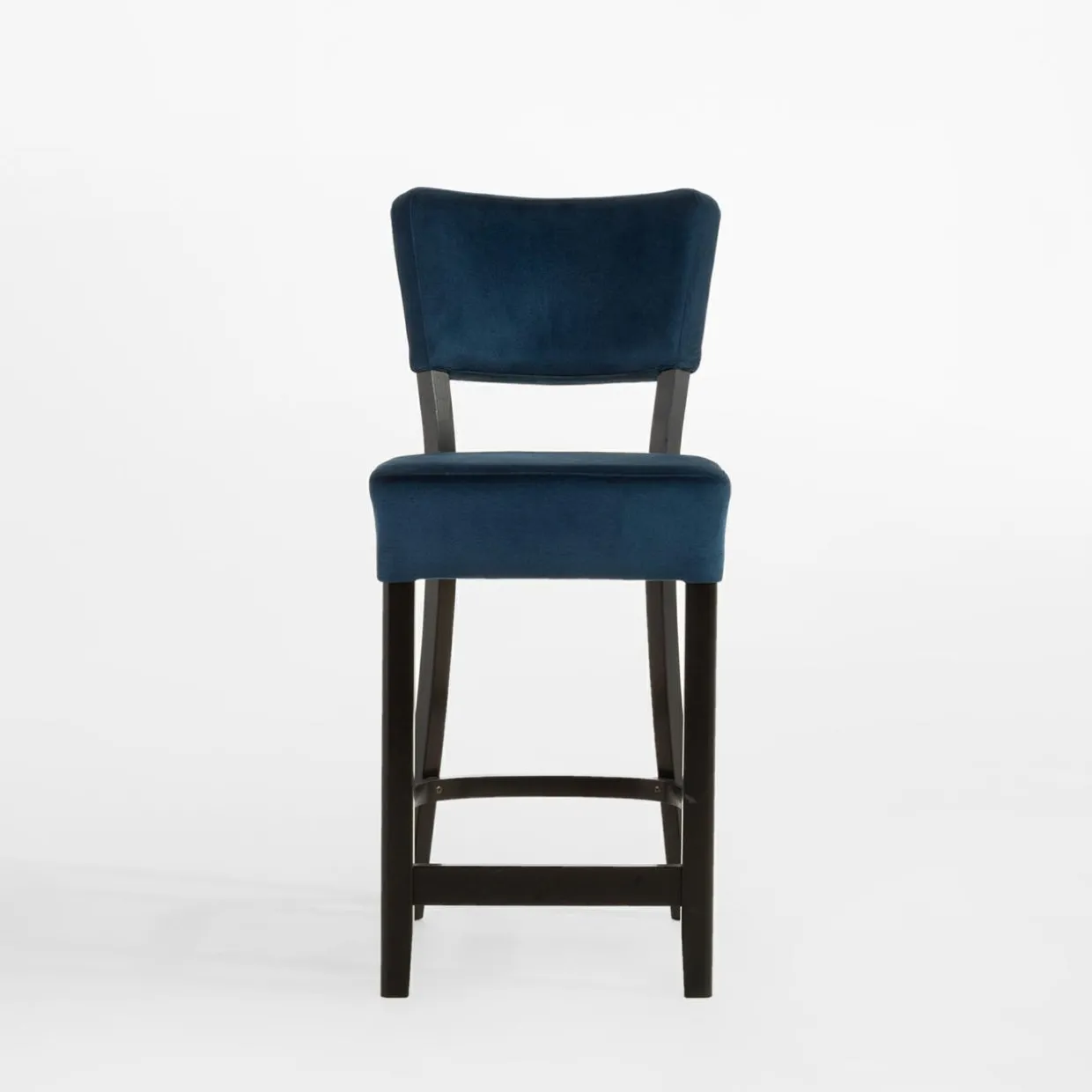 Tapicerowane krzesło barowe sprawi, że strefa z wyspą kuchenną nabierze luksusowego charakteru. Połączenie granatowego weluru z czarnymi nogami z drewna bukowego wygląda bardzo elegancko.