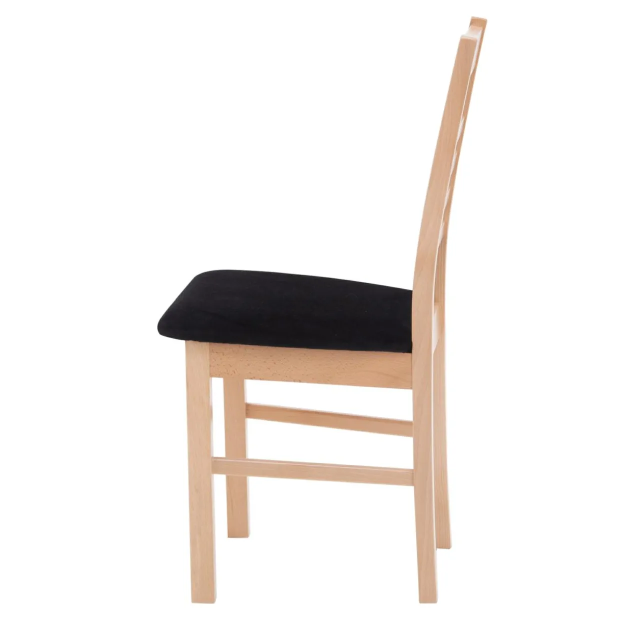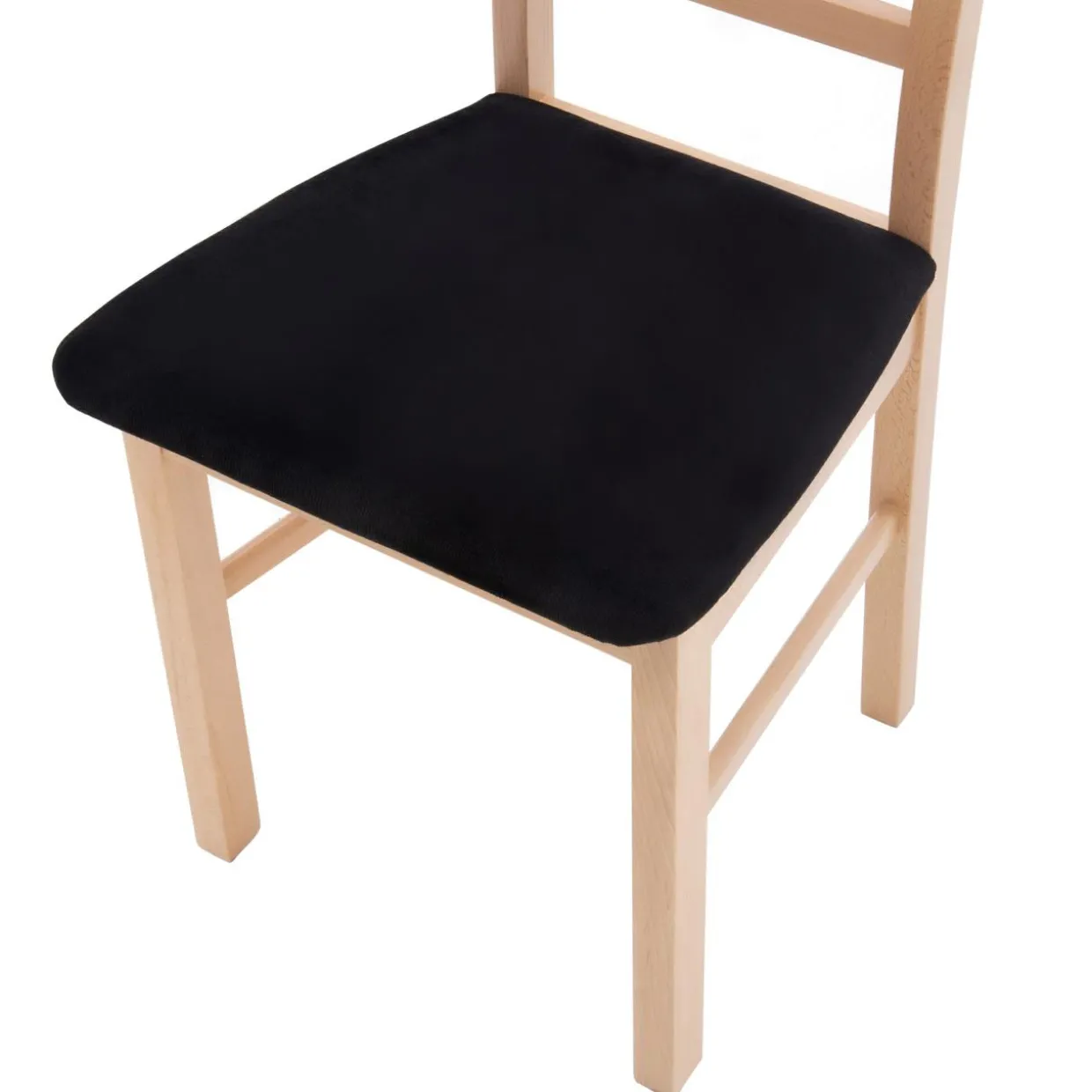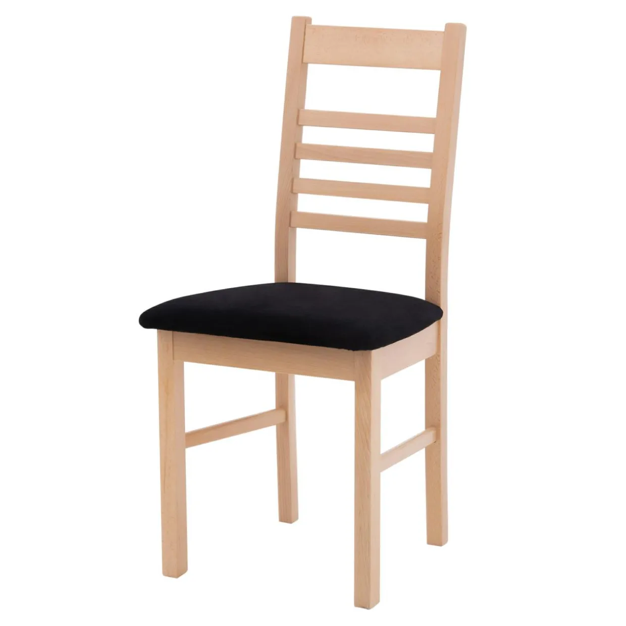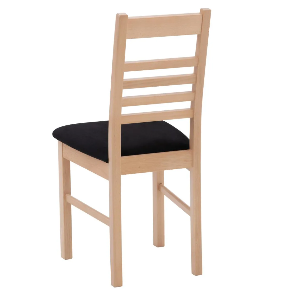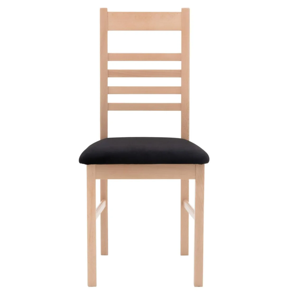 - Krzesło wykonano z drewna bukowego i pokryto bajcą, lakierem. Dzięki temu oparcie i nogi zachowały naturalny, chłodny odcień drewna.