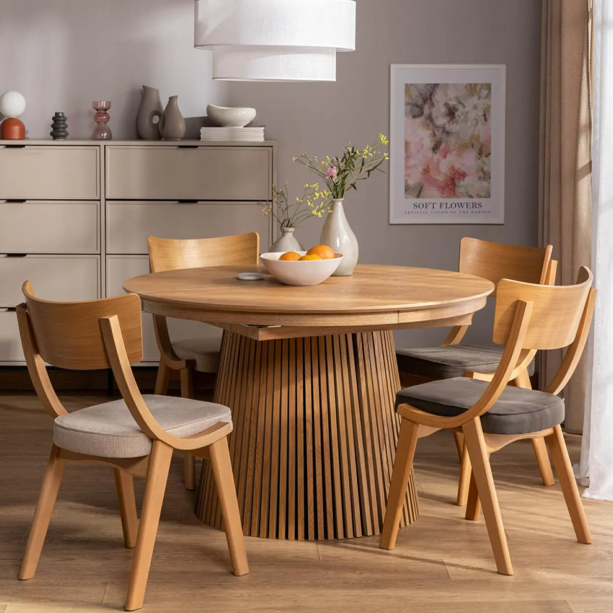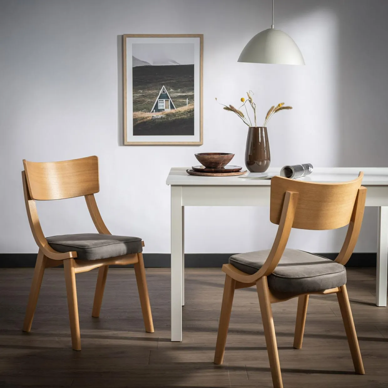 Zestaw je z drewnianym stołem w podobnym odcieniu, a całość będzie prezentowała się spójnie i elegancko.