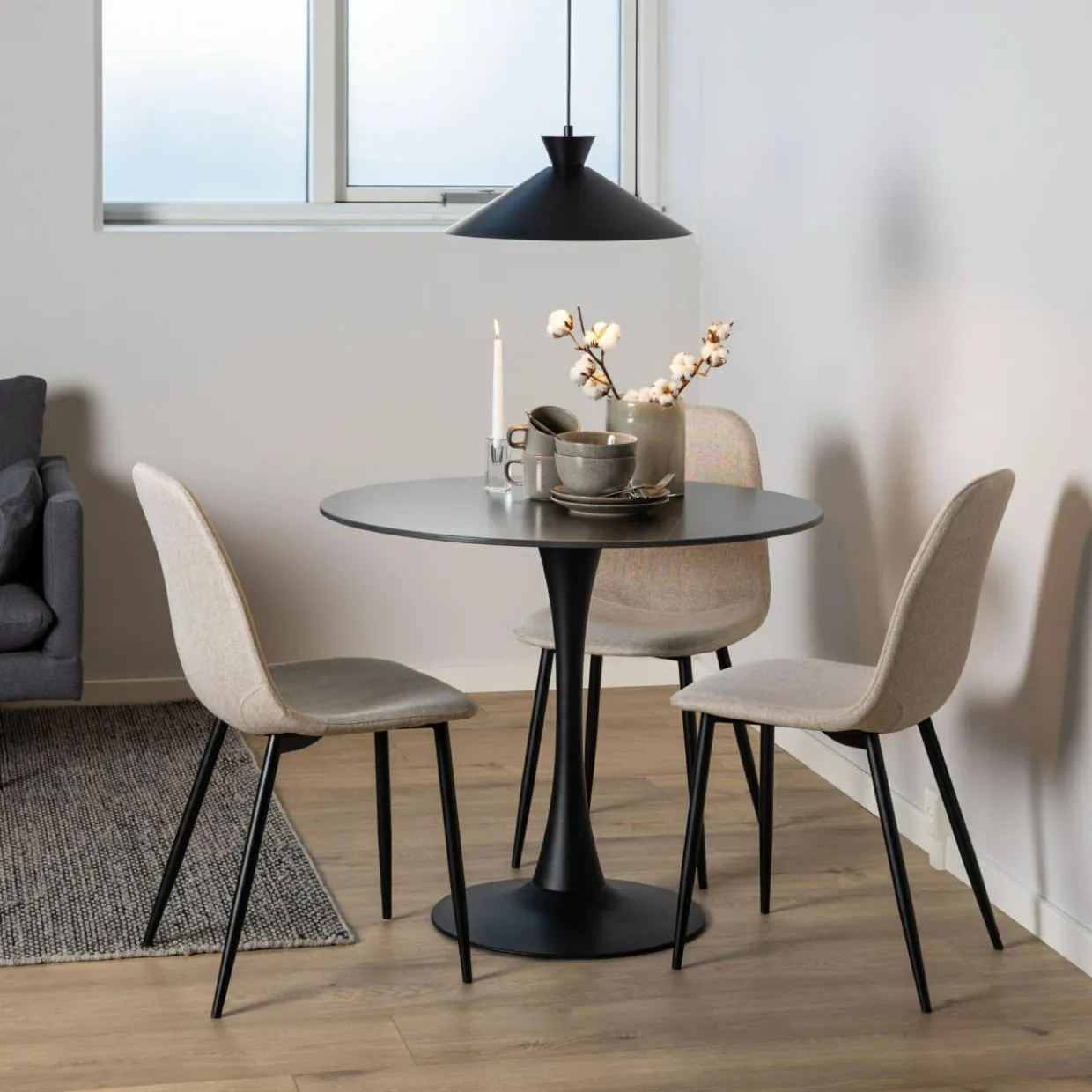 - Cieniutkie nóżki wykonane ze stali nadają krzesłu lekkości. Pomalowano je proszkowo na odcień czarny mat.
