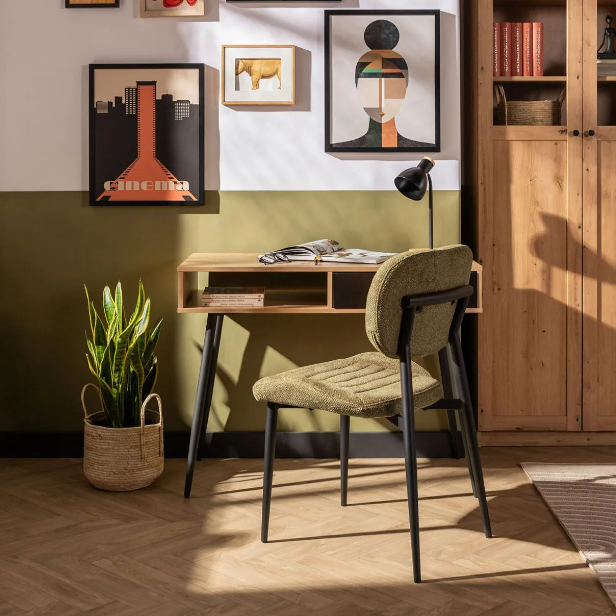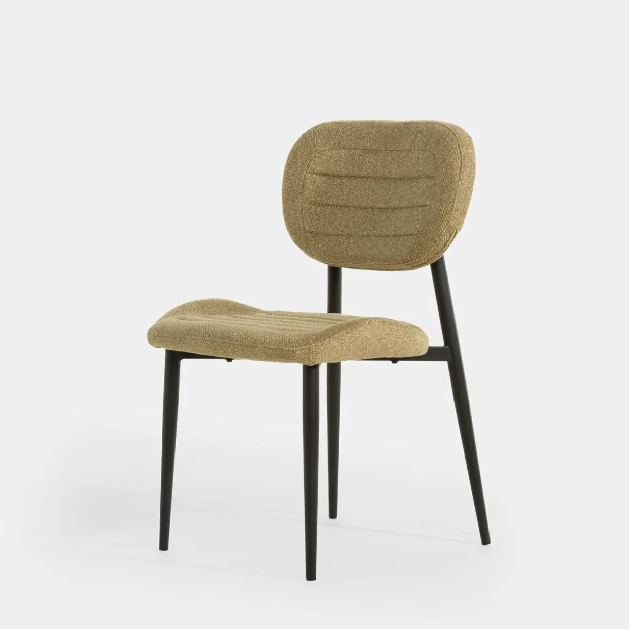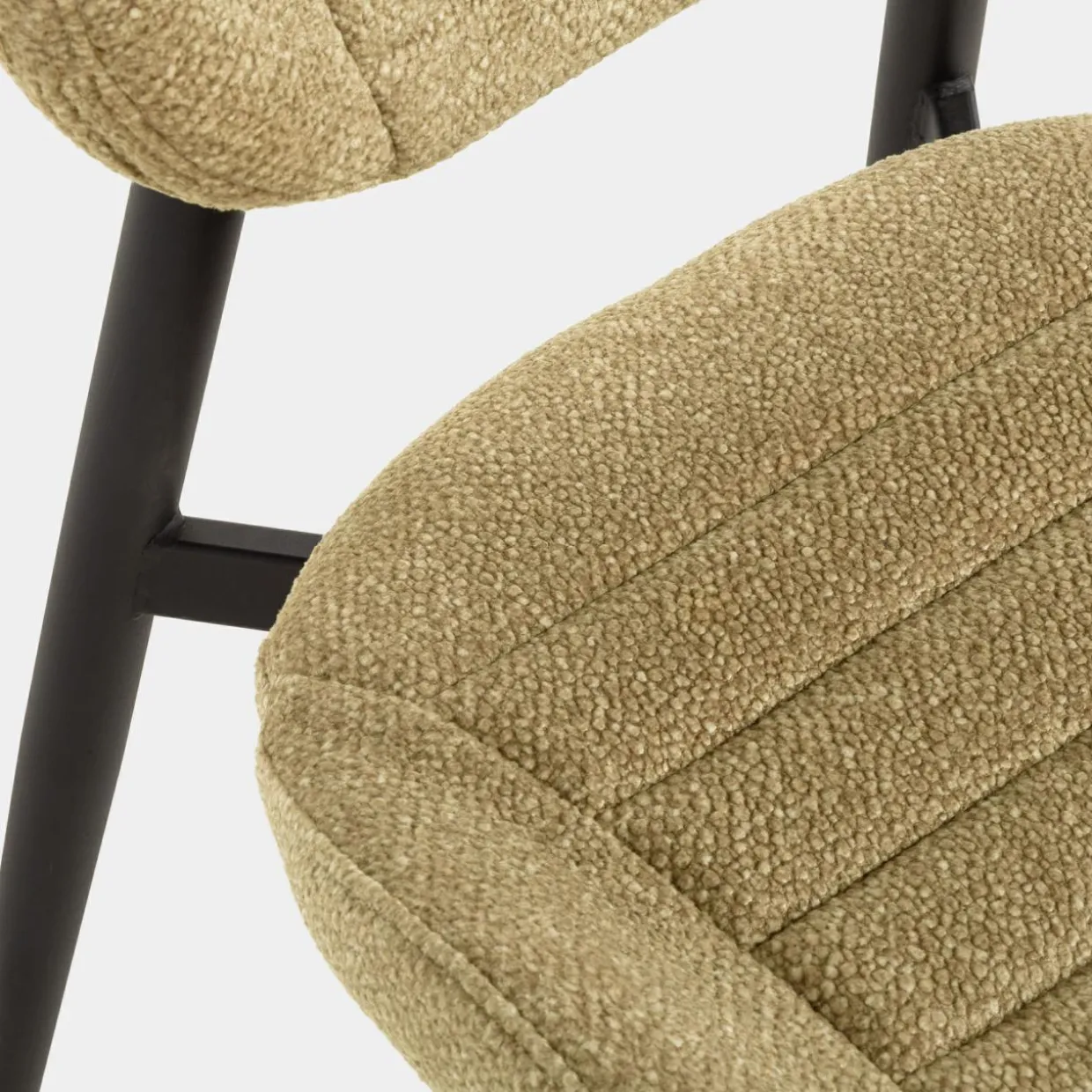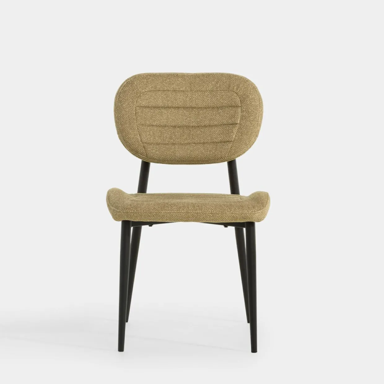Tapicerka jest strukturalna, wyrazista w dotyku, przepleciona nitkami o kilku odcieniach beżu, dlatego krzesło FINESETT z pewnością wyróżni się w Twojej jadalni.