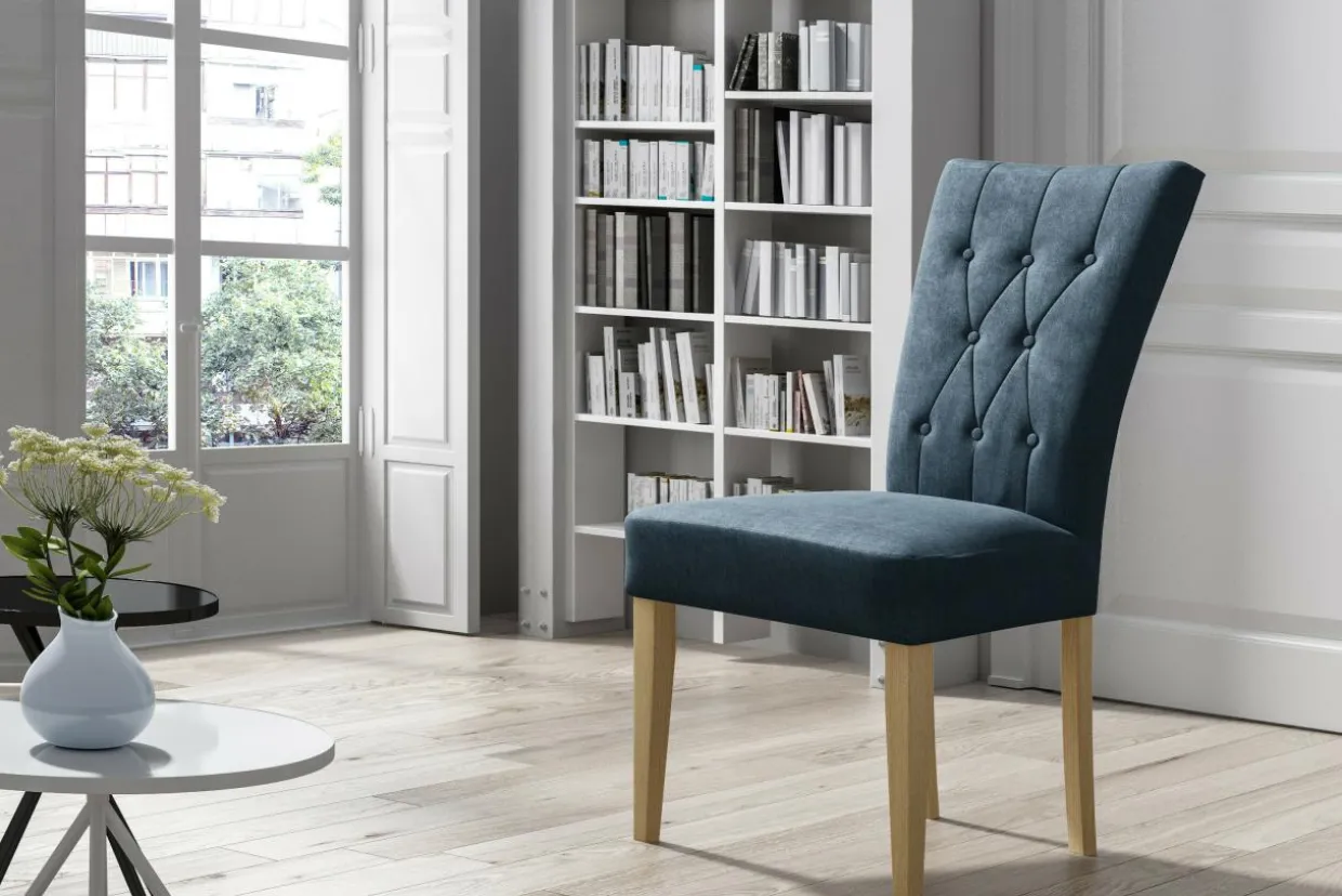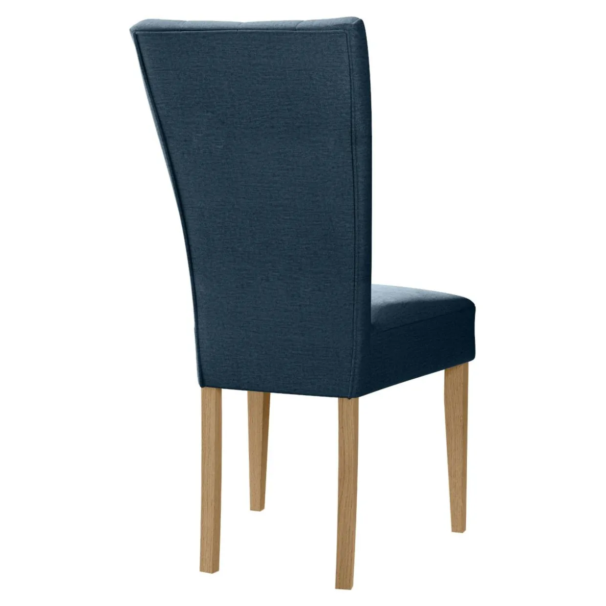 Stelaż i nogi z drewna bukowego w jasnym odcieniu urokliwie kontrastują z ciemnogranatową tapicerką, a wysokie, pikowane oparcie jest lekko profilowane i doskonale dopasowuje się do kształtu pleców.