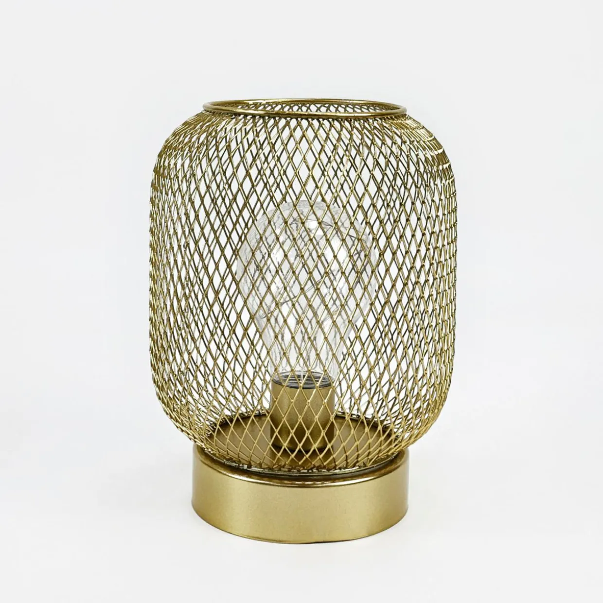 - Klosz lampy ze plecionych na wzór siatki, złotych drucików został ustawiony na płaskiej, okrągłej podstawie.