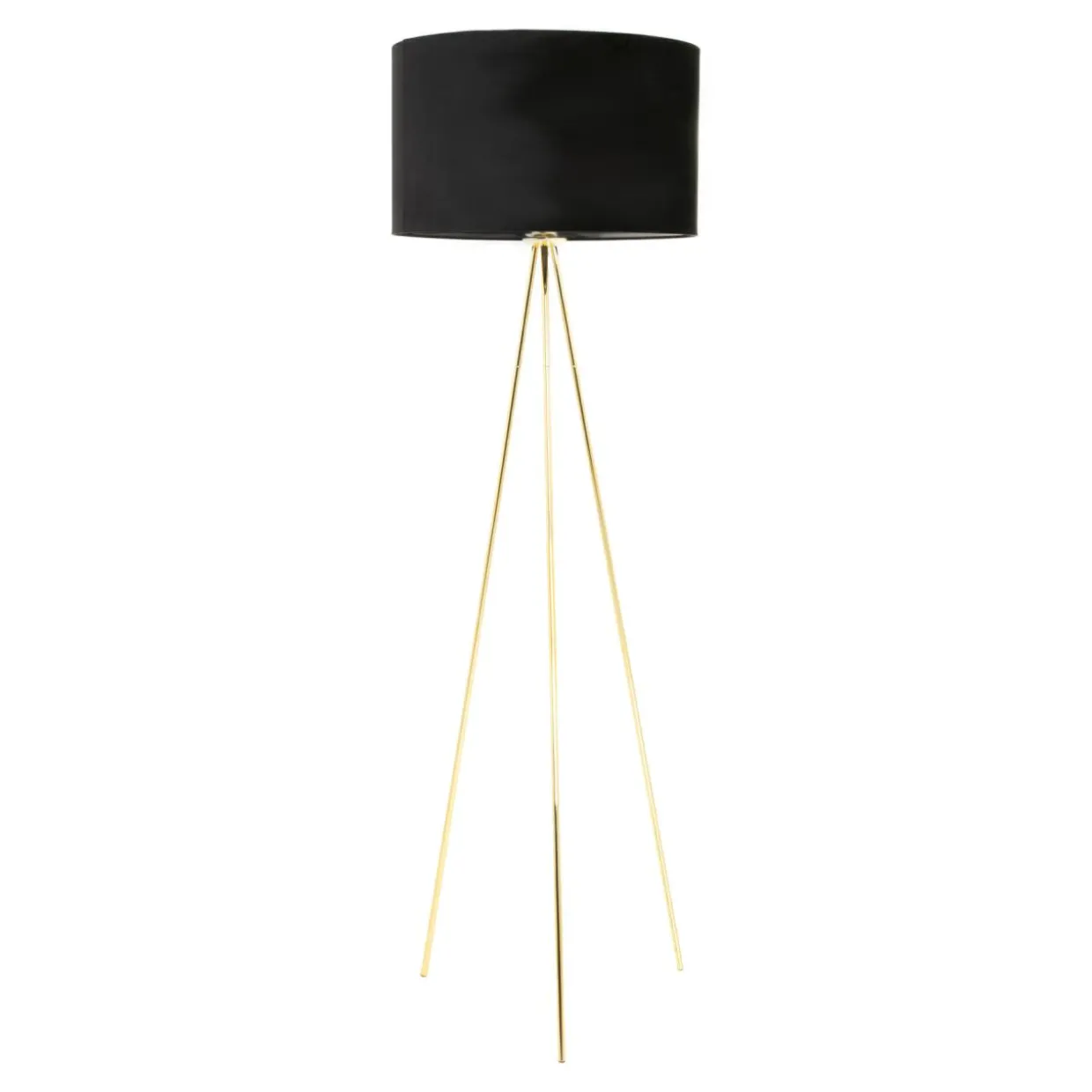 Przede wszystkim zwraca uwagę welurowe wykończenie oraz czarny kolor abażura, który doskonale współgra ze złotym wykończeniem trójnogu.