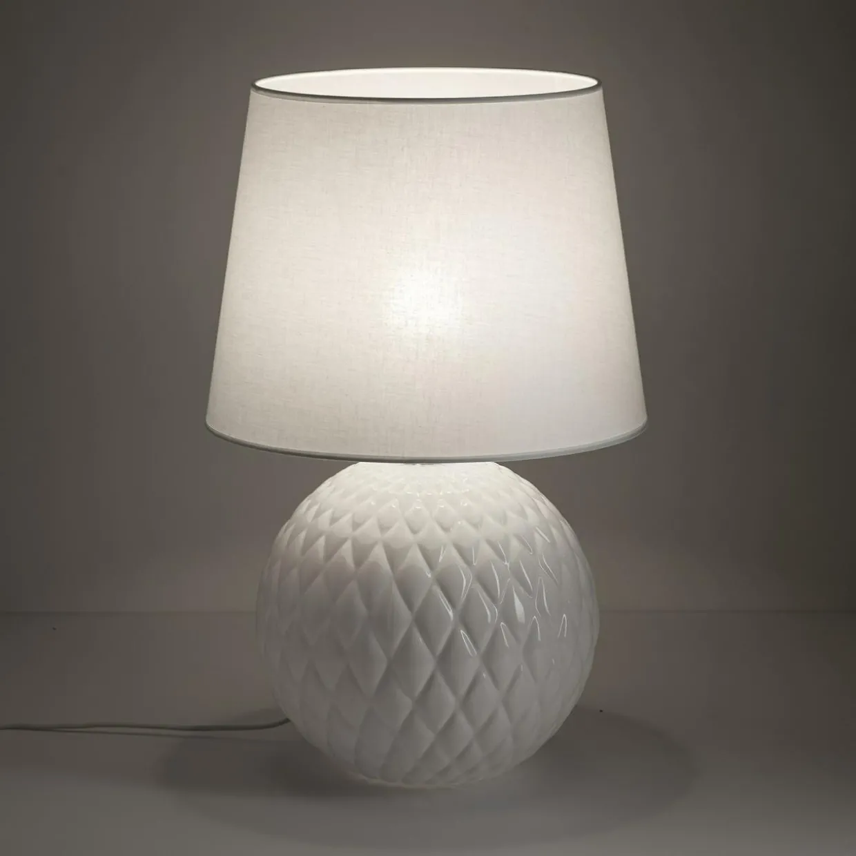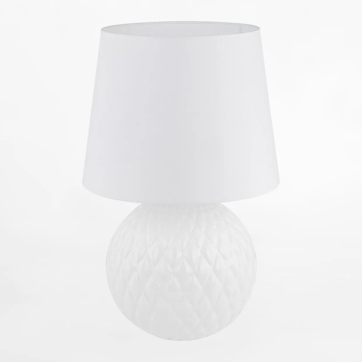 Podstawa lampy SANTANA jest kulista, ze wzorem w romby. Wykonana została ze szkła z białym, lakierowanym wykończeniem przy oprawie żarówki.