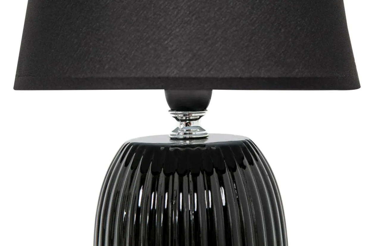 Delikatnie zdobiona podstawa została wzbogacona intrygującym wzorem, dającym wrażenie miękkości. Jego uniwersalność oraz oszczędna estetyka trapezowego klosza pasują do większości wnętrz. Czarna kolorystyka doda elegancji do Twojej sypialni lub pokoju dziennego.