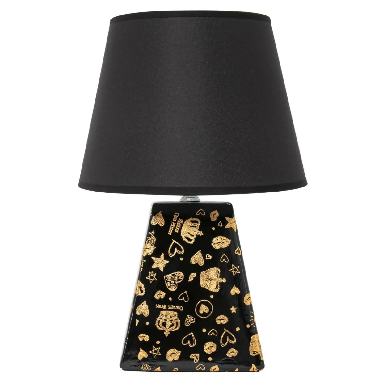 Czworokątna podstawa lampy, lekko zwężająca się ku górze została ozdobiona złotymi grawerunkami, które przedstawiają serca i korony. W znaczący sposób urozmaicają wystrój, dodając nowoczesnego pierwiastka.
