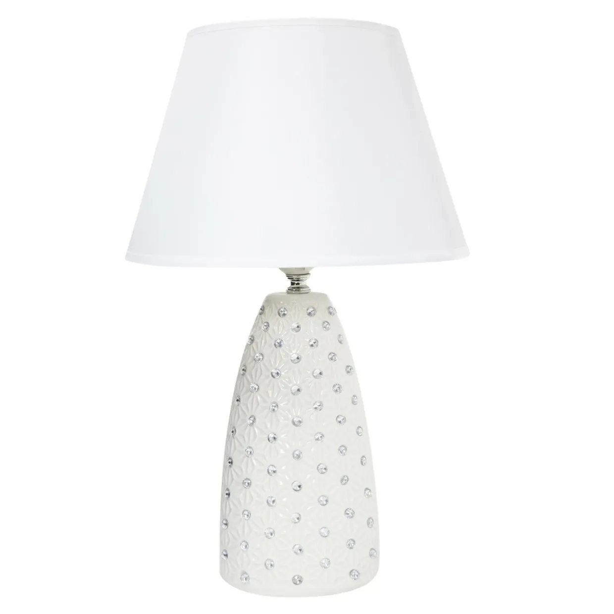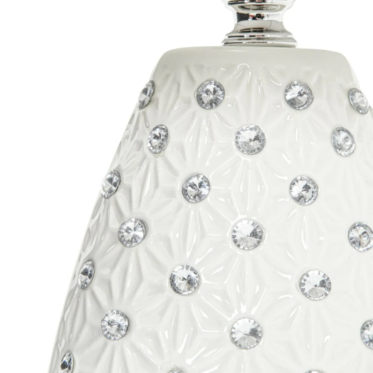 Wysokość 41 cm sprawia, że świetnie odnajduje się w jako znaczący punkt w aranżacji salonu, a wyjątkowy design dodaje elegancji. Biel lampy lekko przełamana srebrnymi cekinami koresponduje z wnętrzami w odcieniach bieli, szarości oraz meblami z jasnego drewna.