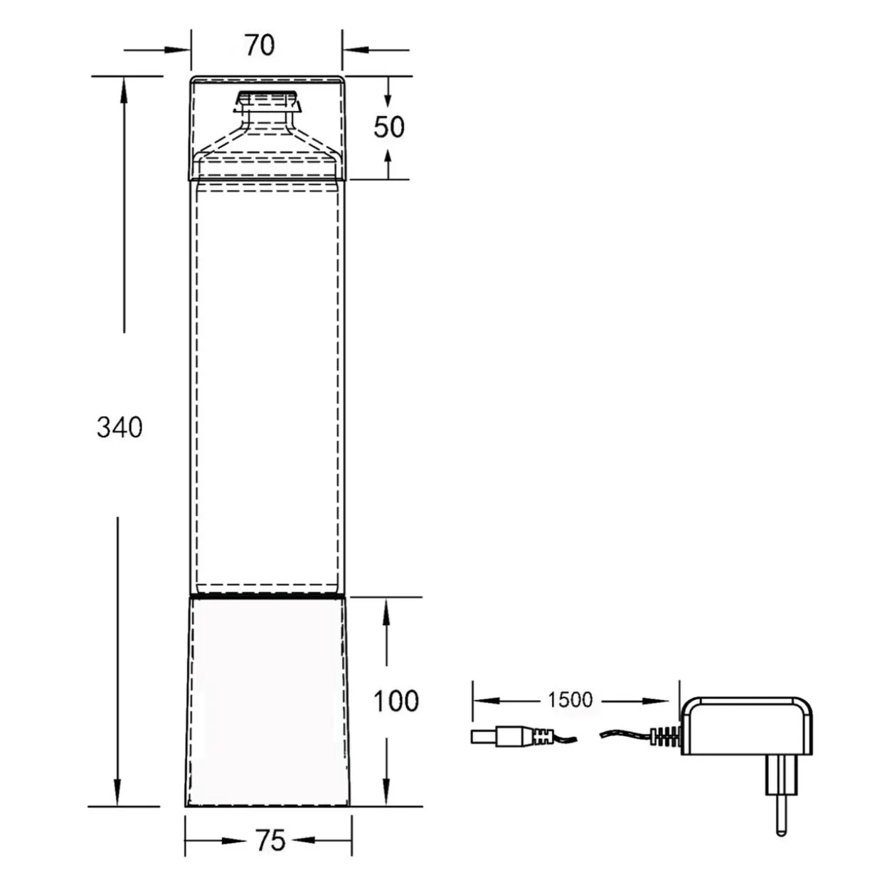 - Wysoka na 34 cm ma kształt walca z podstawą o średnicy 7 cm.