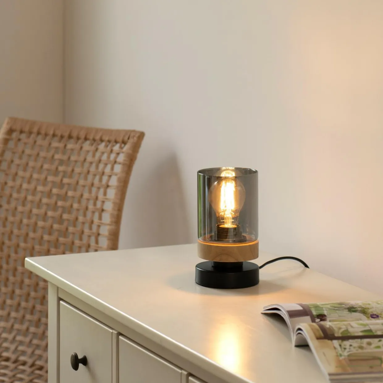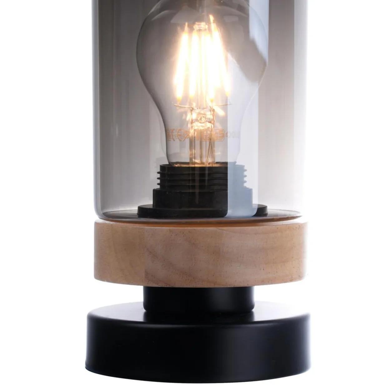 Lampa ma okrągłą, metalową podstawę, wzbogaconą drewnianym wykończeniem. Pojedyncza żarówka została ukryta za transparentnym, lekko przydymionym kloszem.