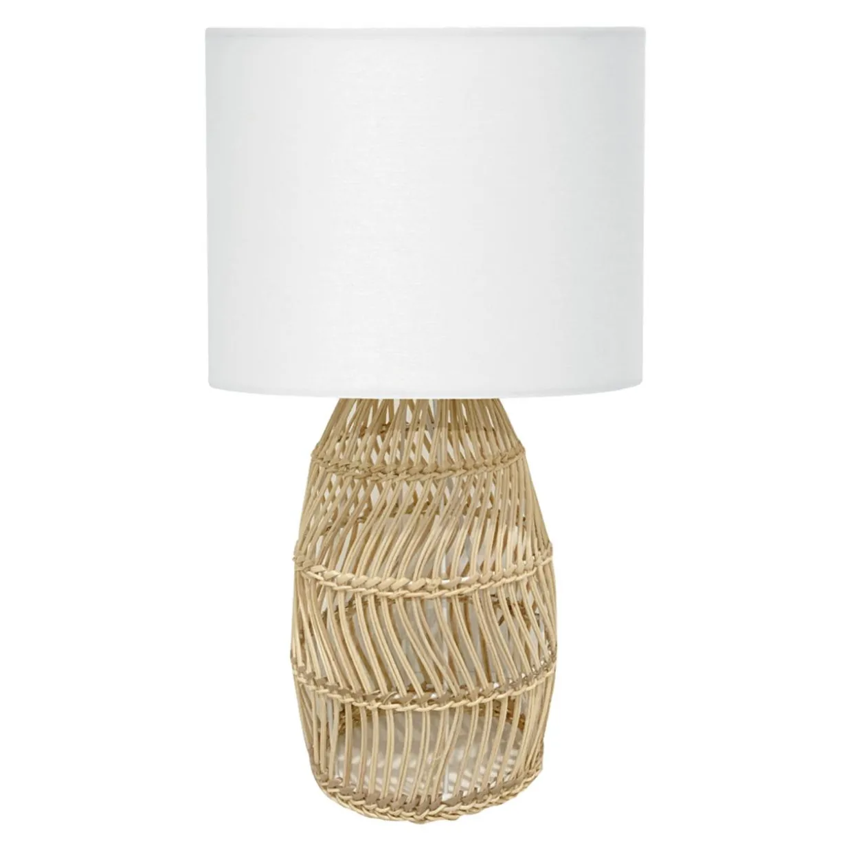 Lampa stołowa KORFU ma podstawę z plecionki w antycznej stylizacji. Jasny, naturalny kolor rattanu podkreśla abażur z białej tkaniny.