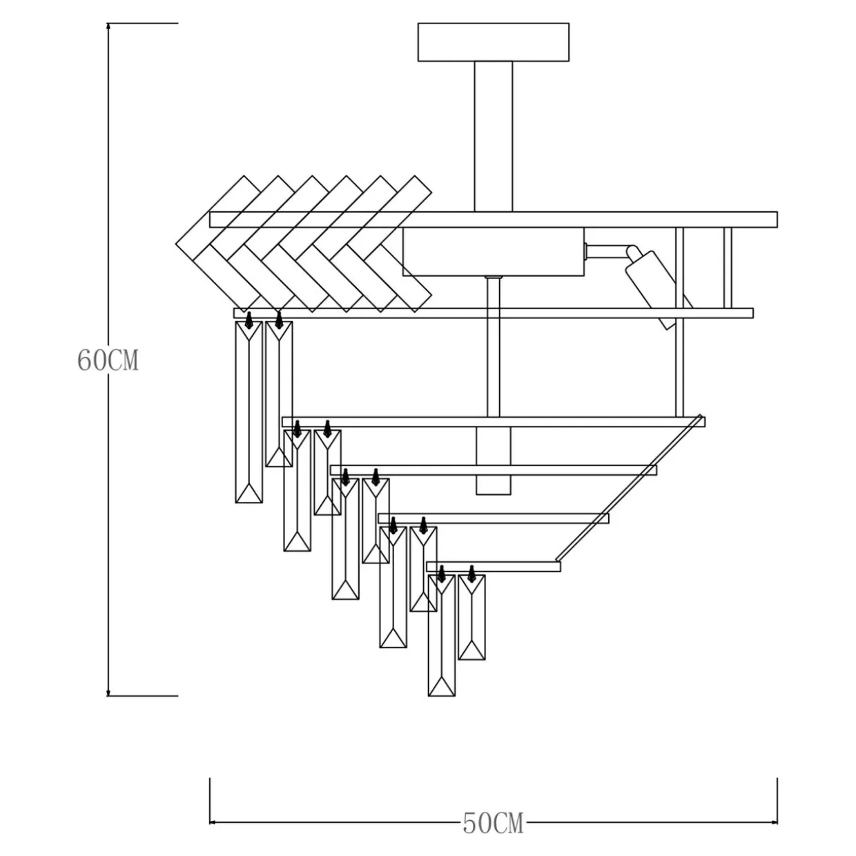 - 5 warstw szklanych ozdób zawieszonych na stelażu w złotym kolorze zostało ułożonych na wzór kaskady – od największego koła do najmniejszego.