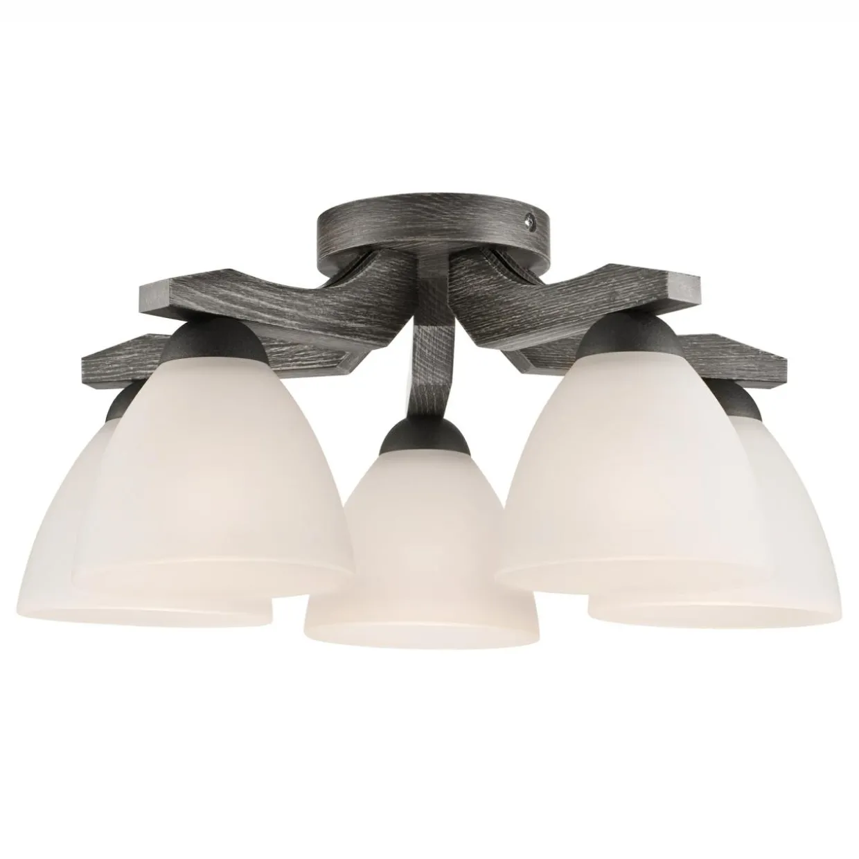Ozdobna część w kolorze grafitu i wzorze drewna połączona została z matową bielą tradycyjnego klosza.