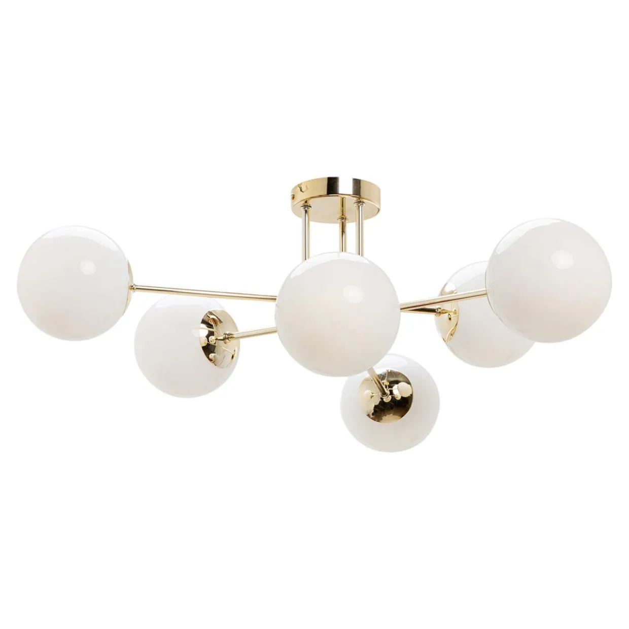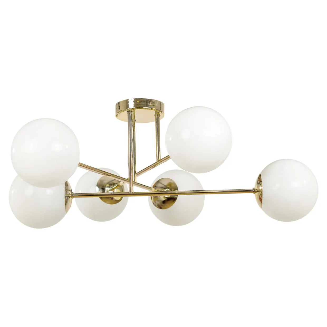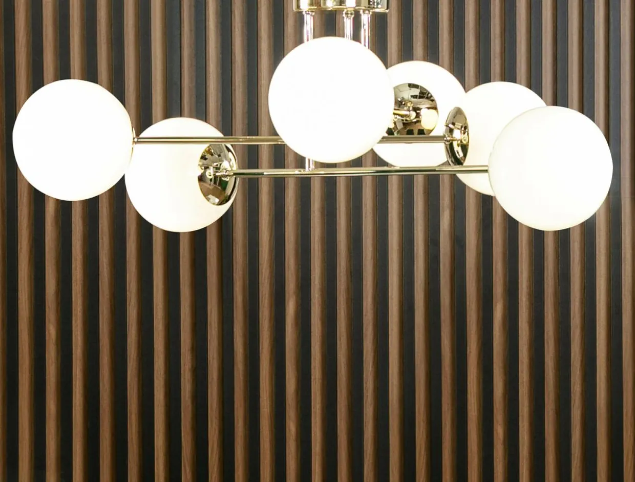 Złota kolorystyka ramion lampy, ich połysk oraz zwieńczenie w postaci okrągłych, mlecznobiałych kloszy w cudowny sposób lawiruje pomiędzy nowoczesnym designem, a zachowawczą formą.