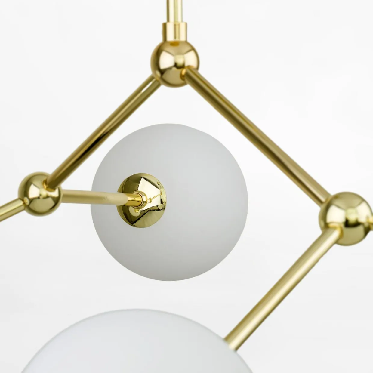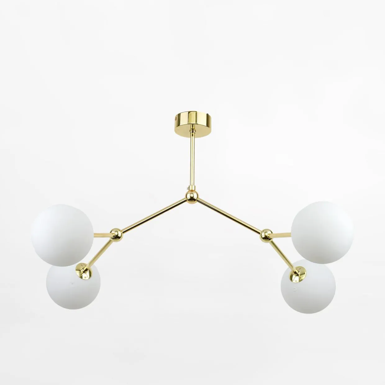 - Prosty, montowany pod sufitem stelaż w złotym kolorze oraz białe, kuliste klosze rozjaśnią i ocieplą wizualnie wnętrze.