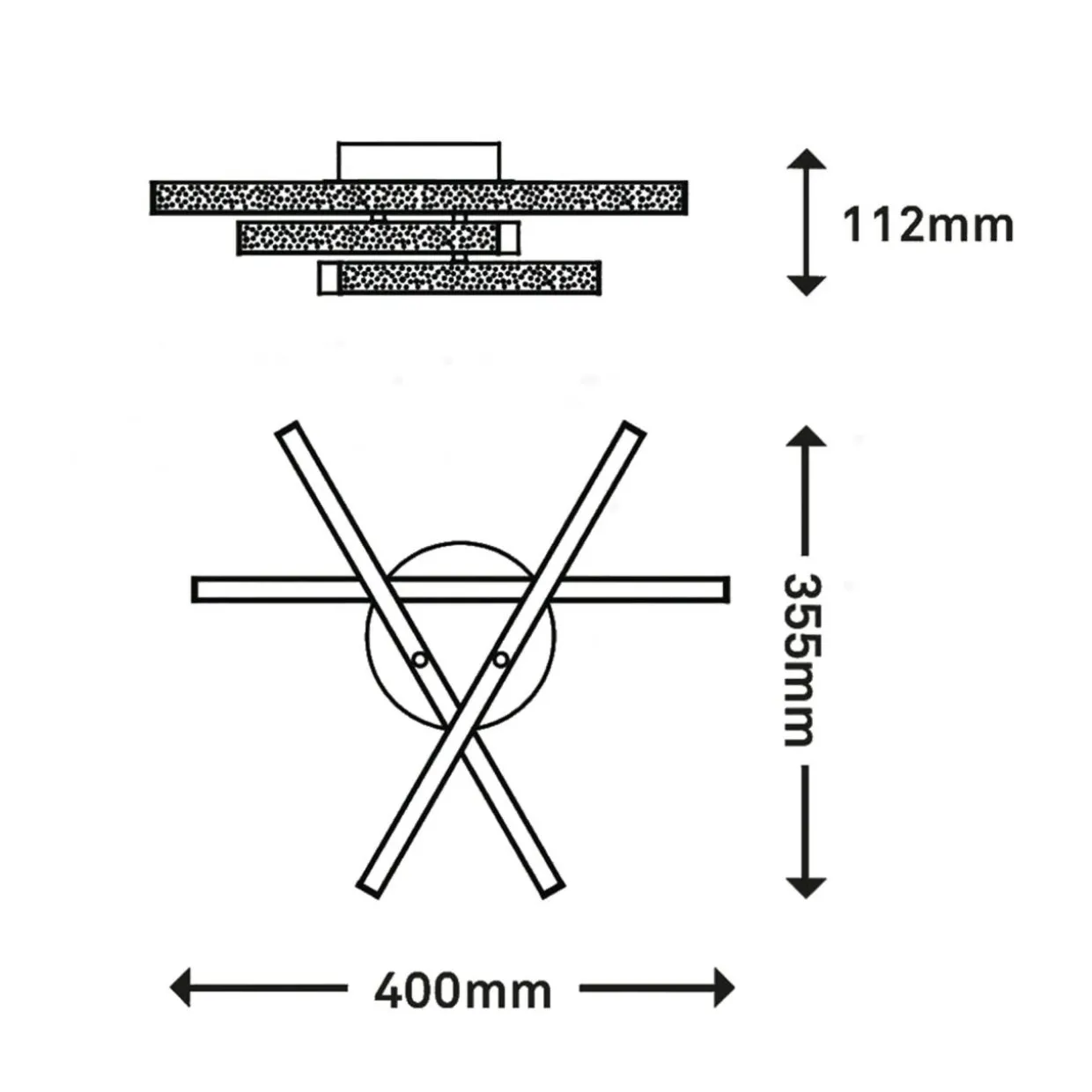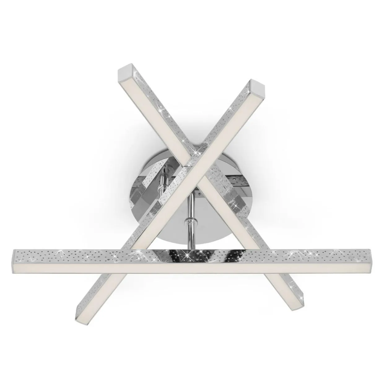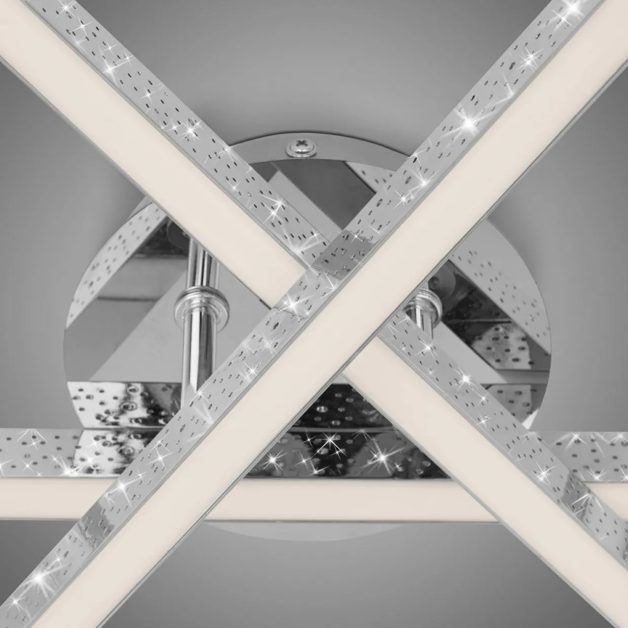 Okrągłą podstawę lampy ozdobiono 3 listwami, których krzyżujące się ramiona tworzą wzór trójkąta. Dodatkowo chromowany kolor wykończenia pasuje do nowoczesnych, minimalistycznych wnętrz i podkreśla efekt, jak dają brokatowe punkciki rozsiane po całej oprawie.