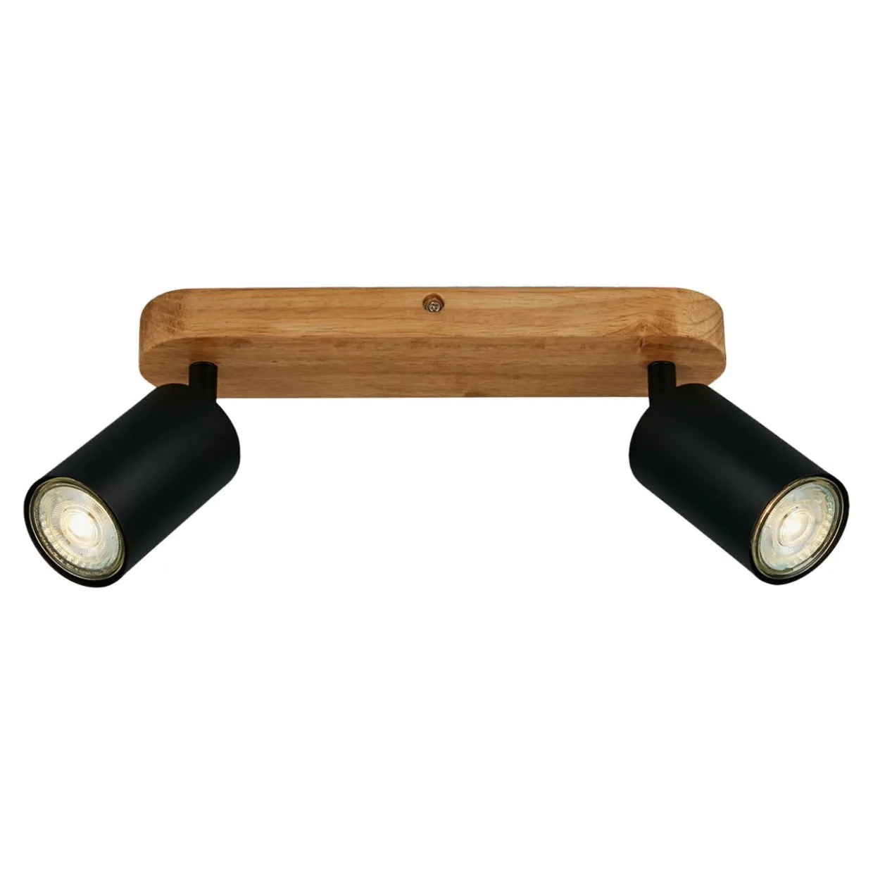 Podstawę stanowi listwa w kolorze jasnego drewna, lekko kontrastująca z 2 czarnymi kloszami o kształcie walców.