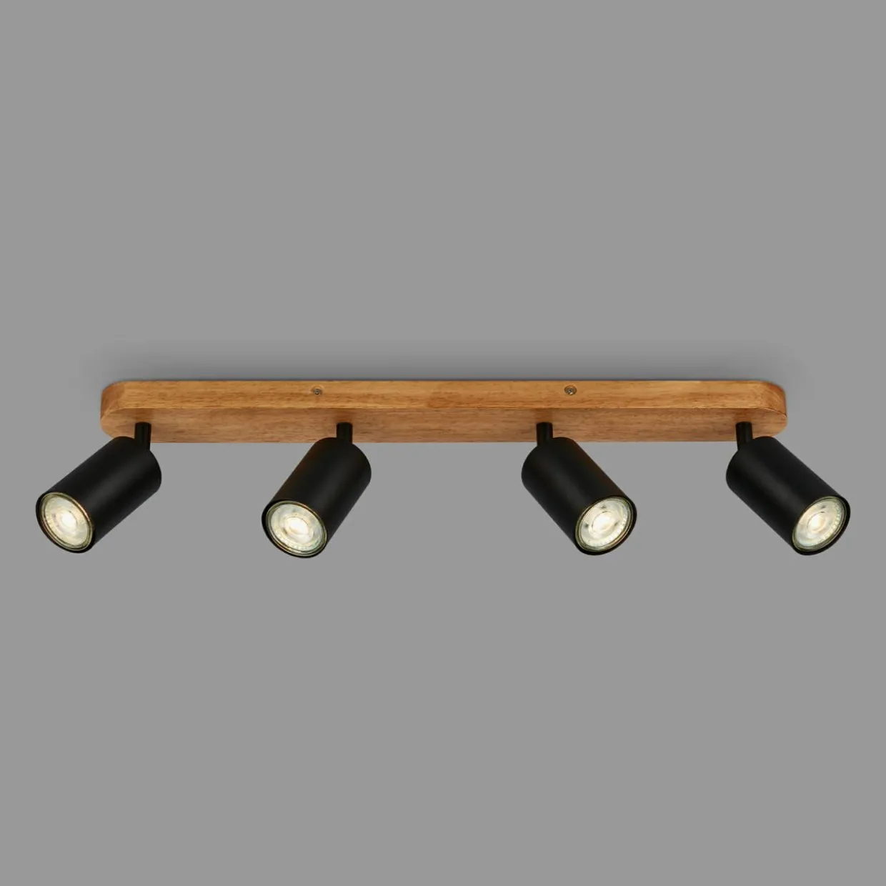 Podstawę stanowi listwa w kolorze jasnego drewna, lekko kontrastująca z 4 czarnymi kloszami o kształcie walców.