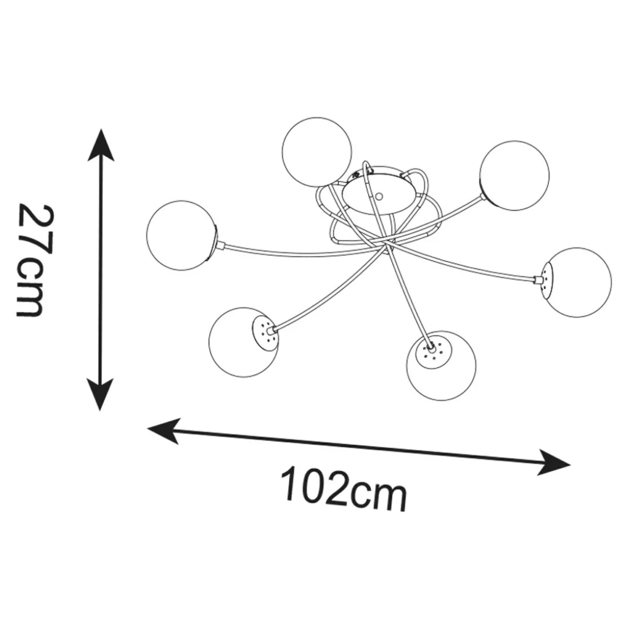 Zwraca uwagę chromowaną podstawą oraz promieniście umieszczonymi ramionami, które zostały zwieńczone szklanymi kloszami. Ich kulisty kształt oraz lekko przydymiona kolorystyka doskonale pasują do wnętrz utrzymanych w jasnej tonacji. Podkreślają nowoczesny charakter wnętrza i świetnie korespondują ze srebrnymi oraz szklanymi dodatkami dekoracyjnymi.