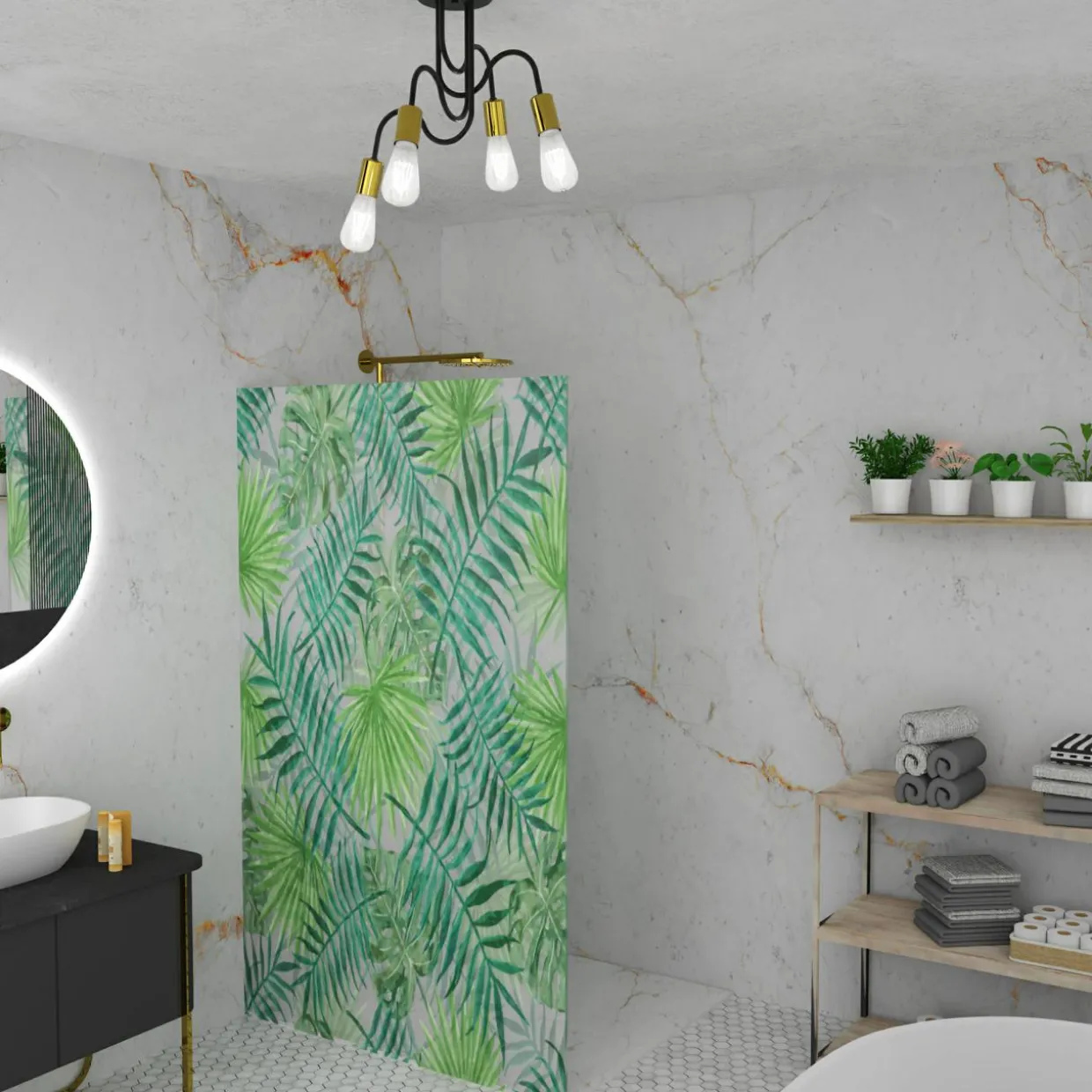 Okrągła podstawa lampy oraz jej ramiona wykonano z metalu wykończonego czarnym, matowym kolorem z dodatkami w lśniącej barwie złota przy oprawie żarówek.