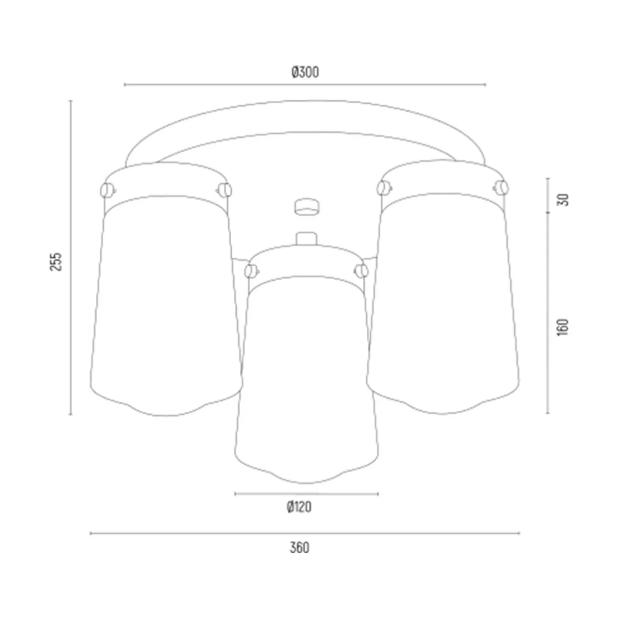 Posiada błyszczące wykończenie w kolorze mosiądzu oraz 3 białe klosze na okrągłej podstawie z miejscem na żarówki typu E27.
