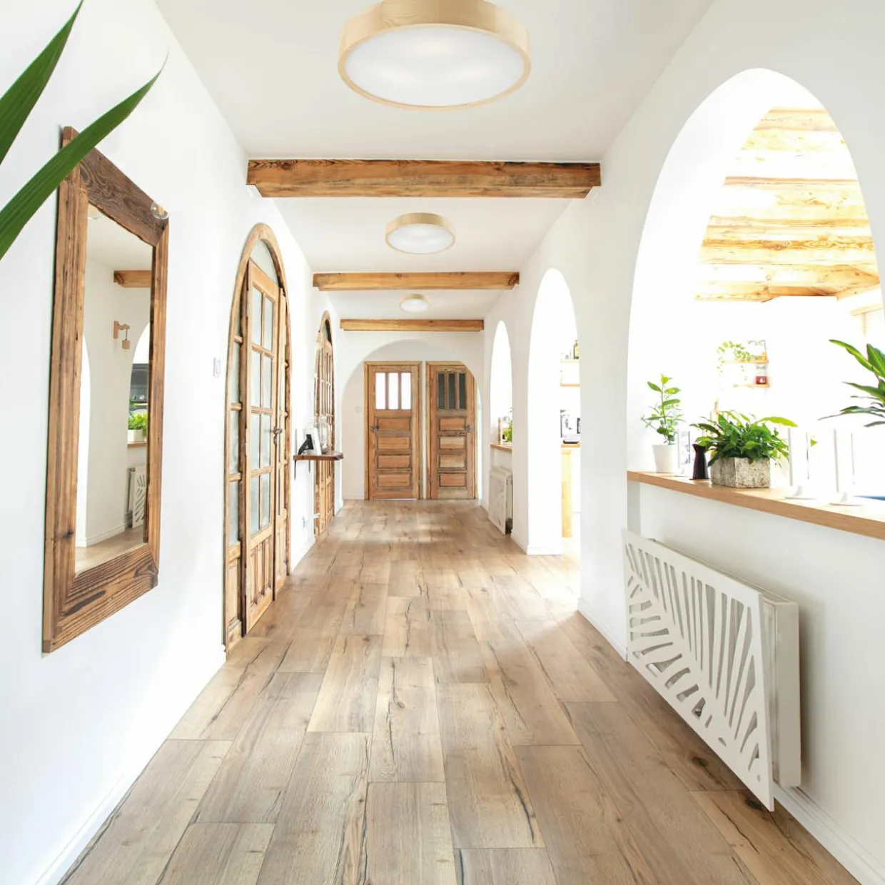 Jasny kolor sosnowego wykończenia oprawy lampy wydobywa naturalne piękno z mebli oraz dodatków dekoracyjnych w odcieniach drewna. Połącz ją z bielą ścian, ciepłym odcieniem złota oraz żywą zielenią roślin. Jest cennym dodatkiem do pomieszczeń użytkowych, w których ważne jest odpowiednie naświetlenie.