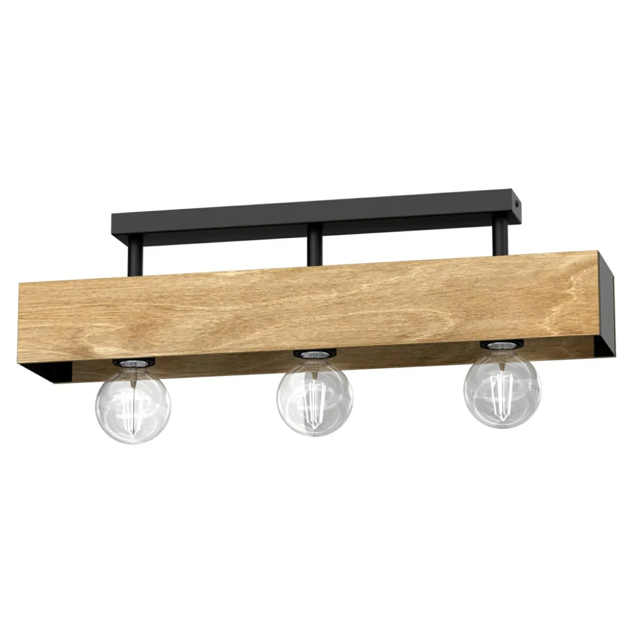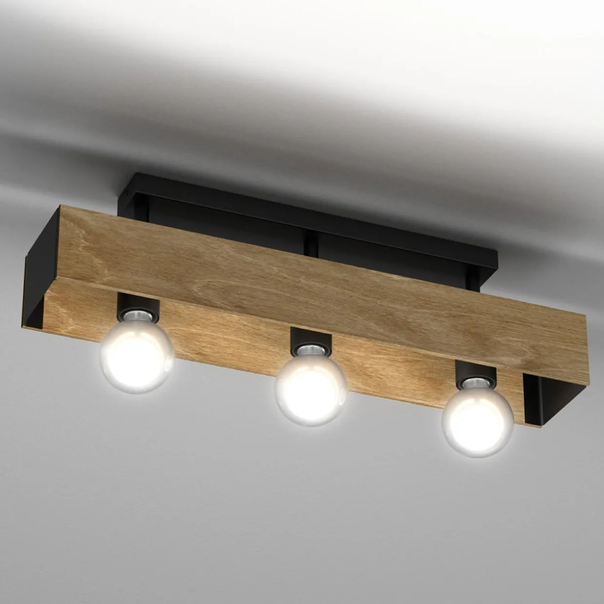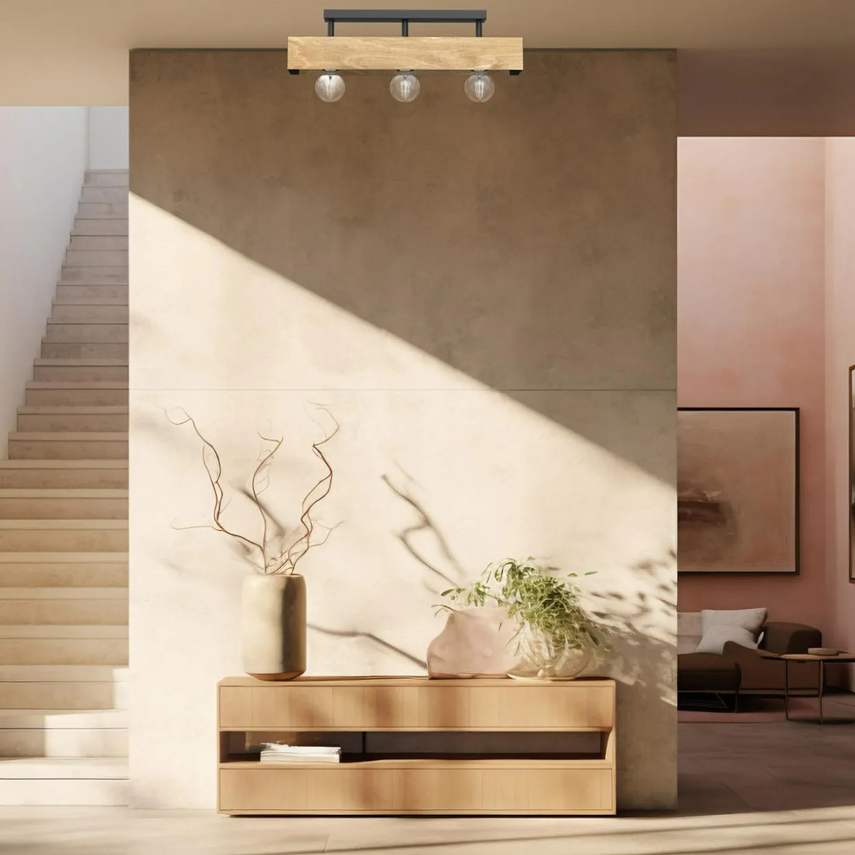Geometryczny design z drewnianą osłoną na 3 żarówki stawia na prostotę kompozycji i naturalność.