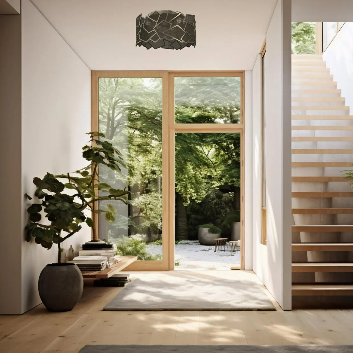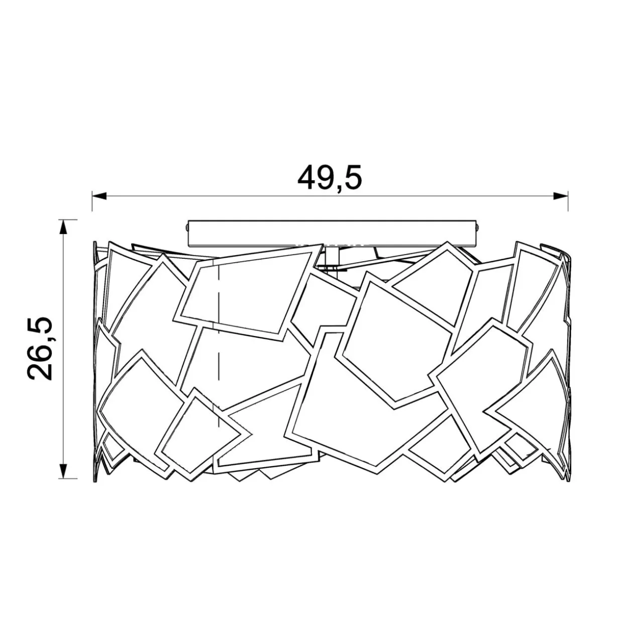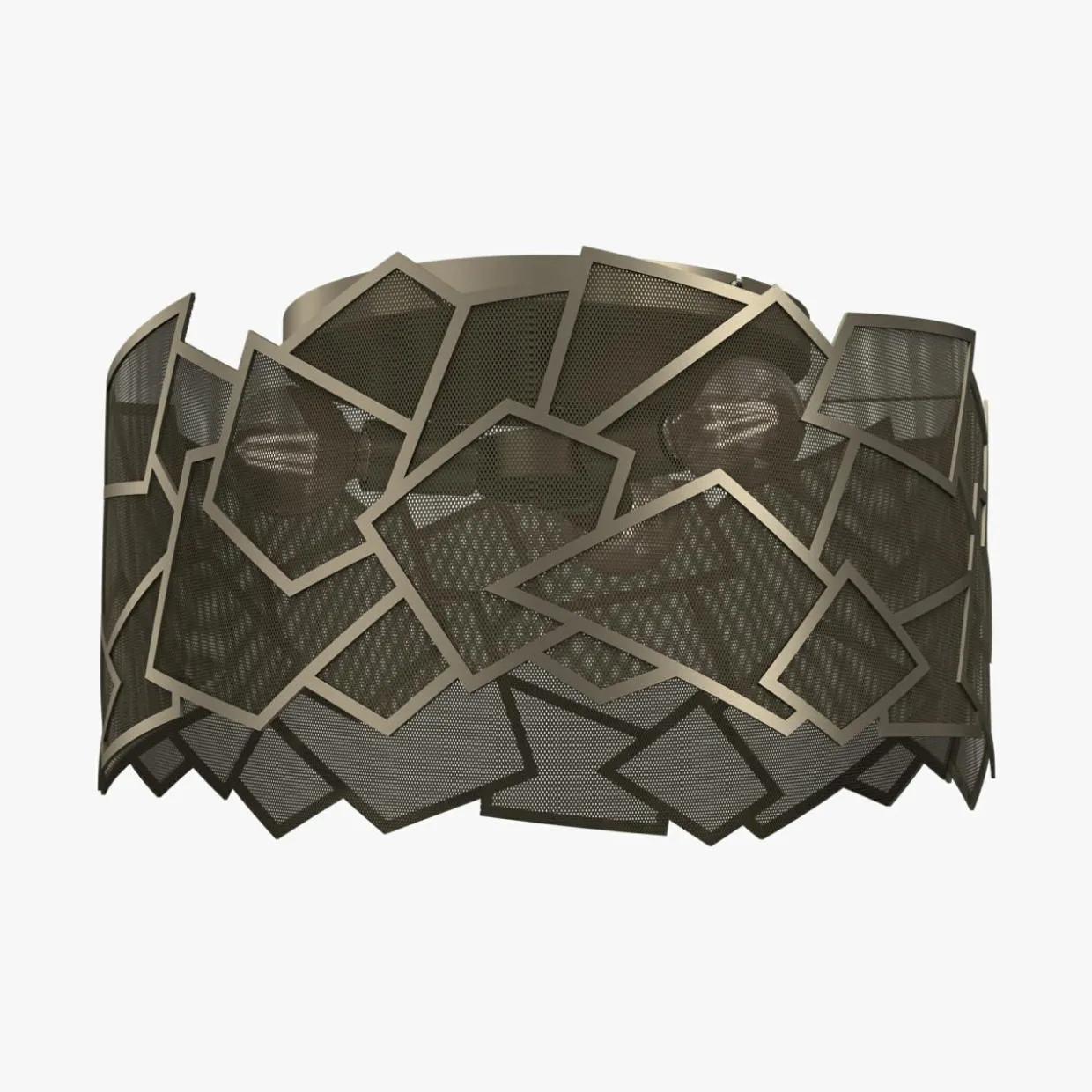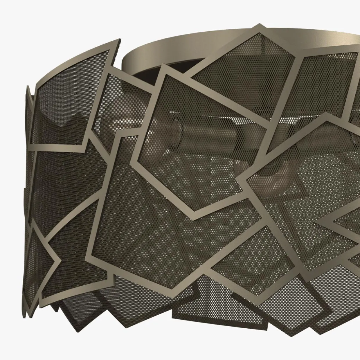 - Metalowy abażur sufitowej lampy CAMO zwraca uwagę ciekawym wzorem – siateczka w wpisana w ostro zakończone geometryczne figury. Nachodzące na siebie kształty dyskretnie przysłaniają żarówki.