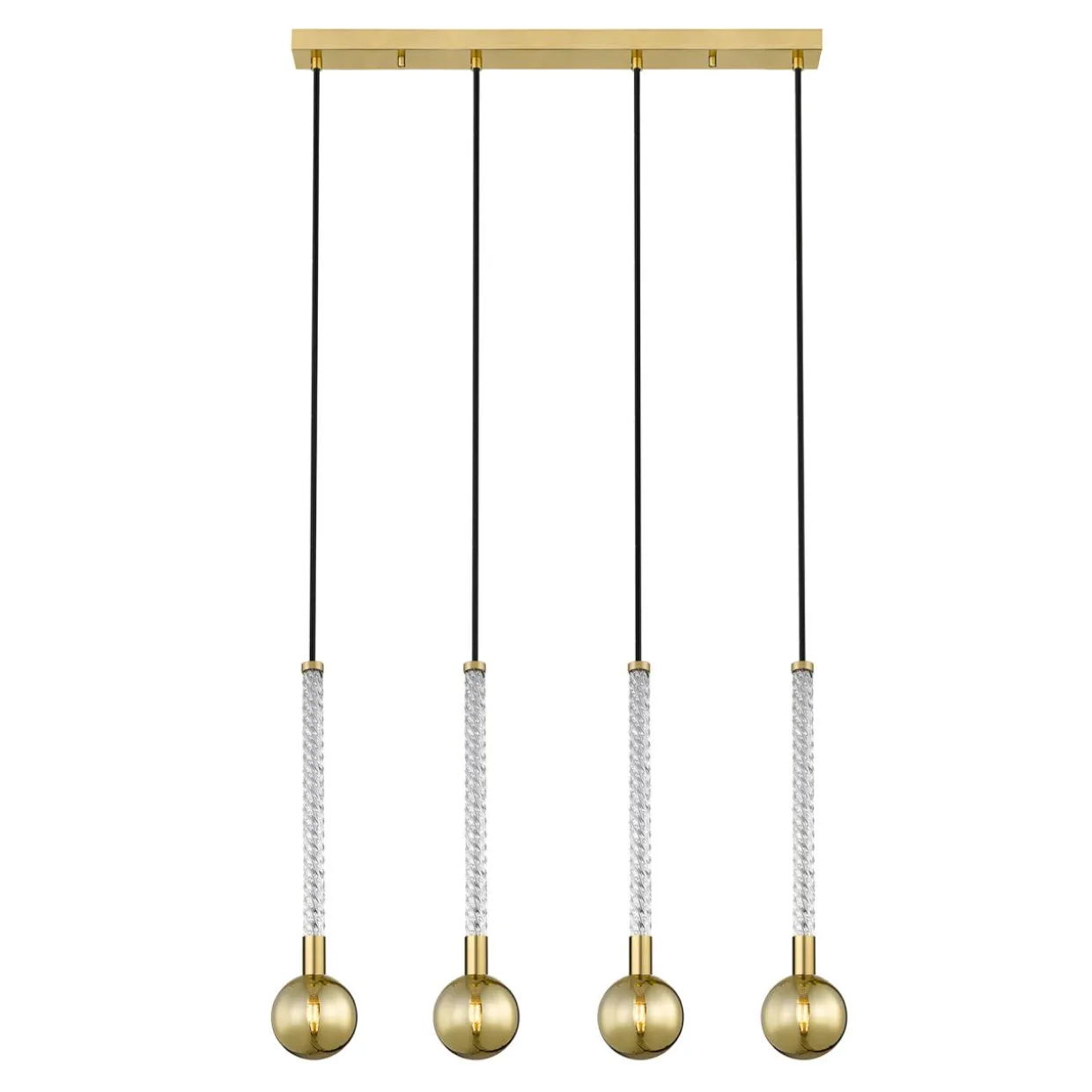 - Klosze o kształcie kuli zawieszone na metalowej podsufitce o kształcie wąskiej listwy są transparentne z mosiężnym poblaskiem.