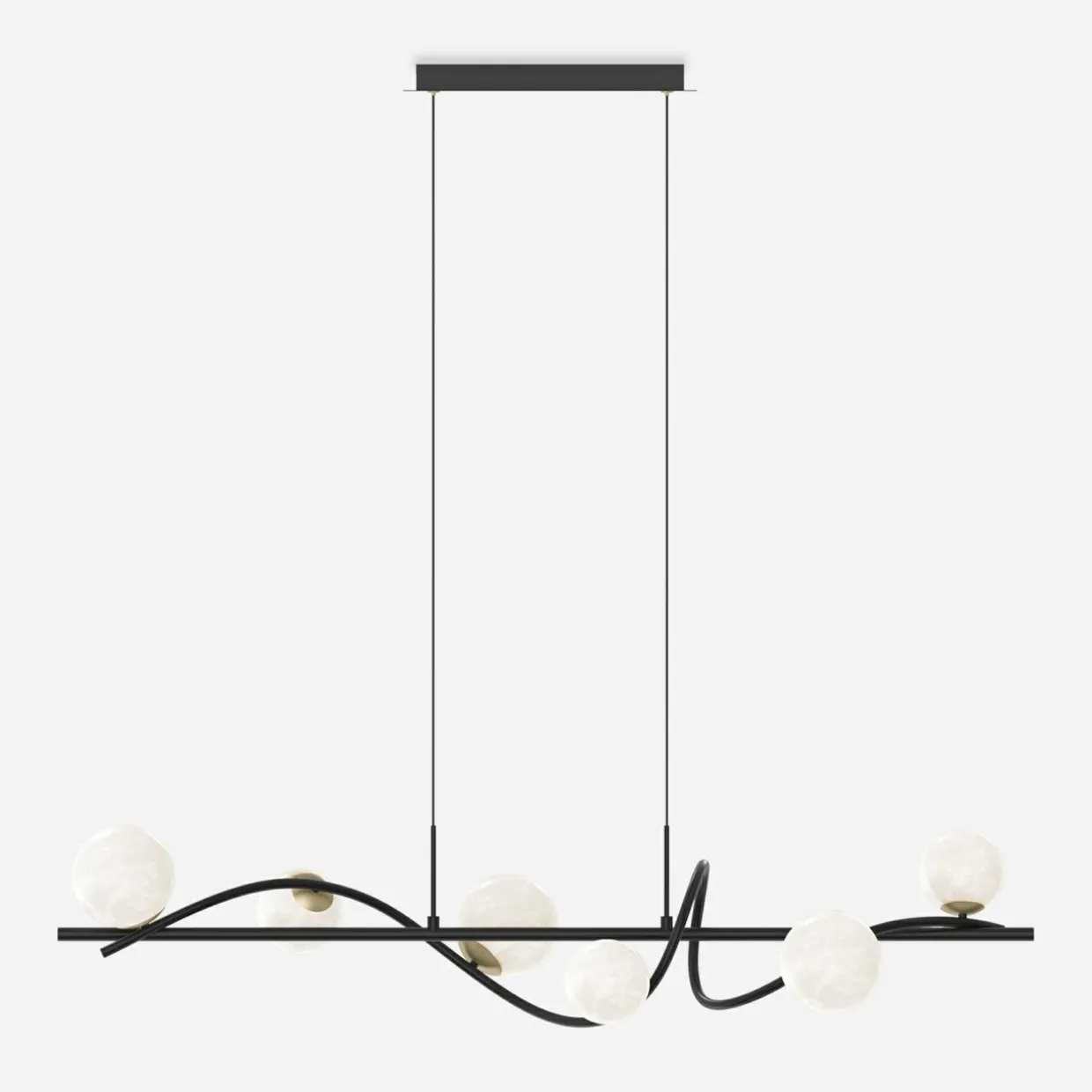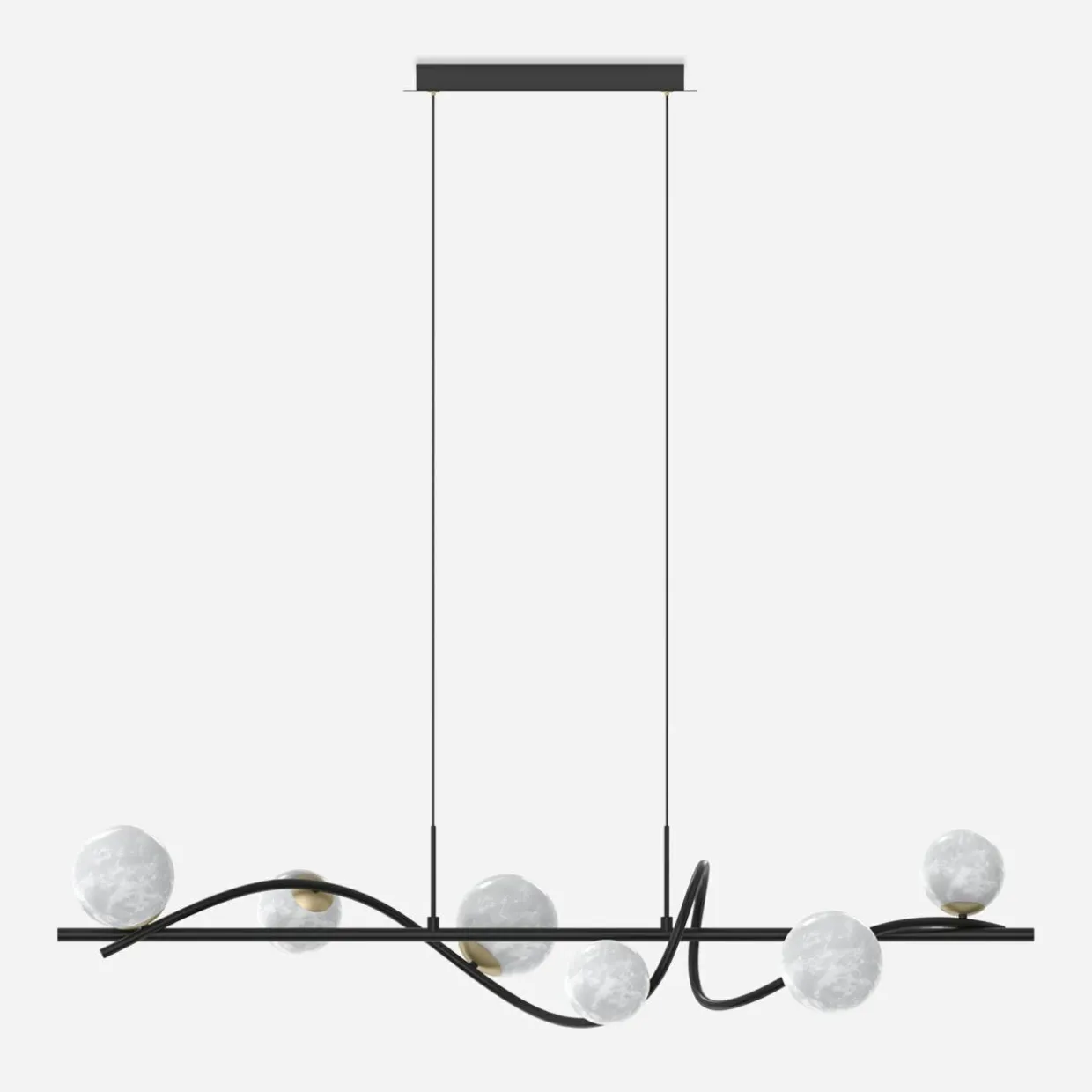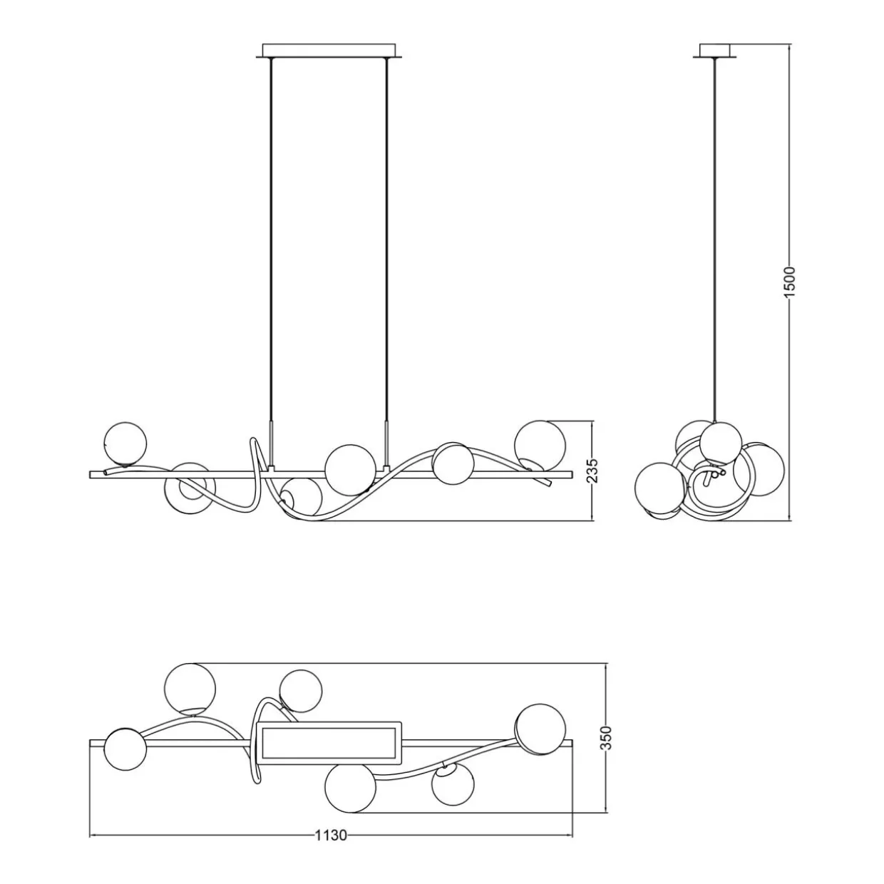 Jej czarna oprawa o kształcie wstęgi została upiększona aż 6 kulistymi kloszami o wykończeniu w perłowej bieli i matowym złocie.