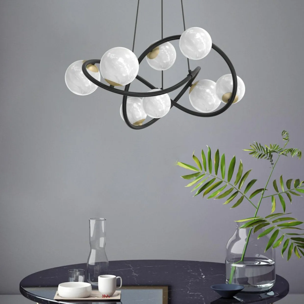 - Zestawienie czarnej oprawy z białymi kulami kloszy to wykończenie oryginalne i pasujące zarówno do stylizacji nowoczesnej, jak również loftowej.