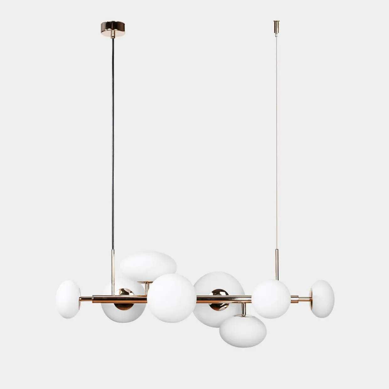 - Oprawa wykończona złotym kolorem została dopełniona przez mlecznobiałe klosze o obłym kształcie. To zestawienie wpasuje się w nowoczesne wnętrze, ciążące w stronę estetyki glamour.