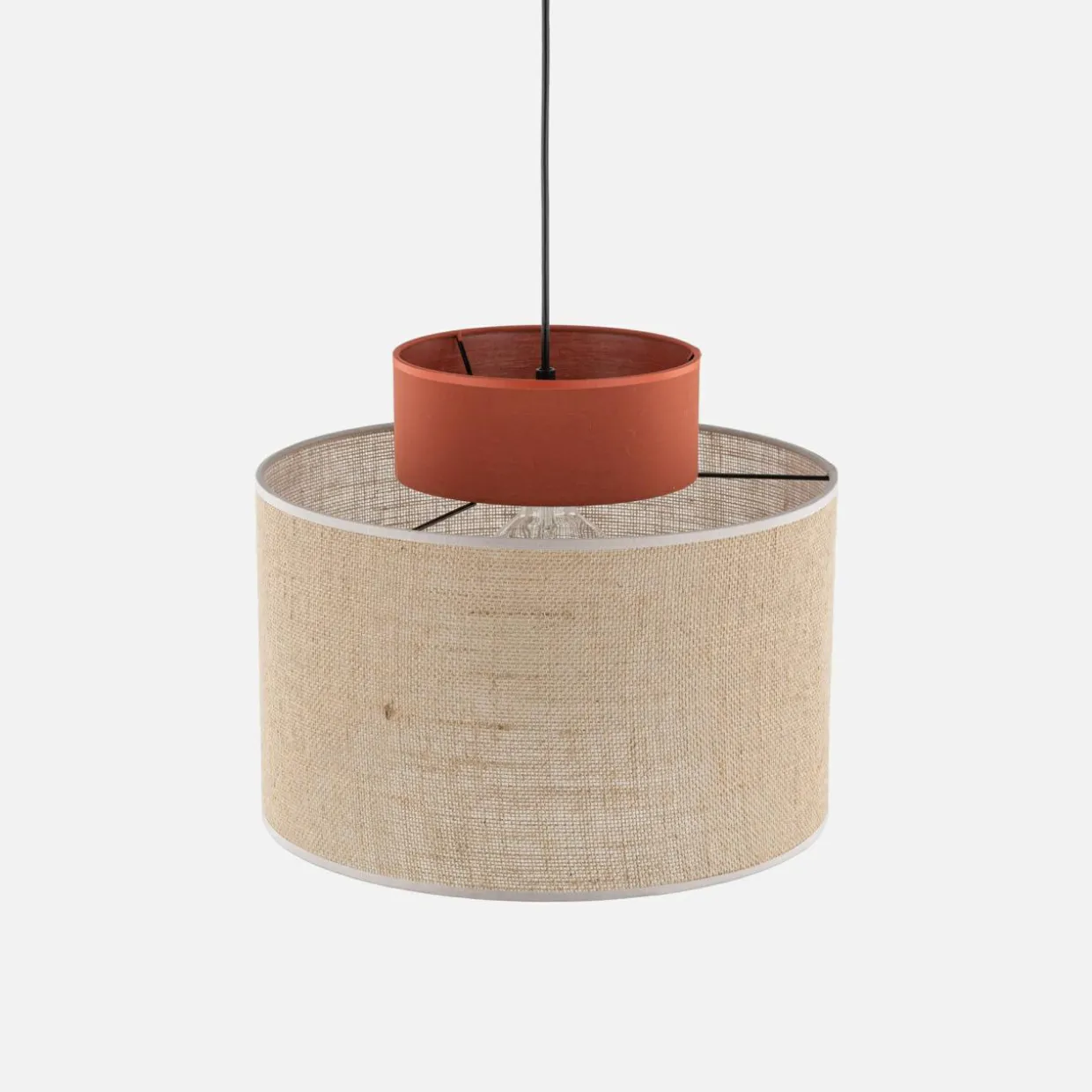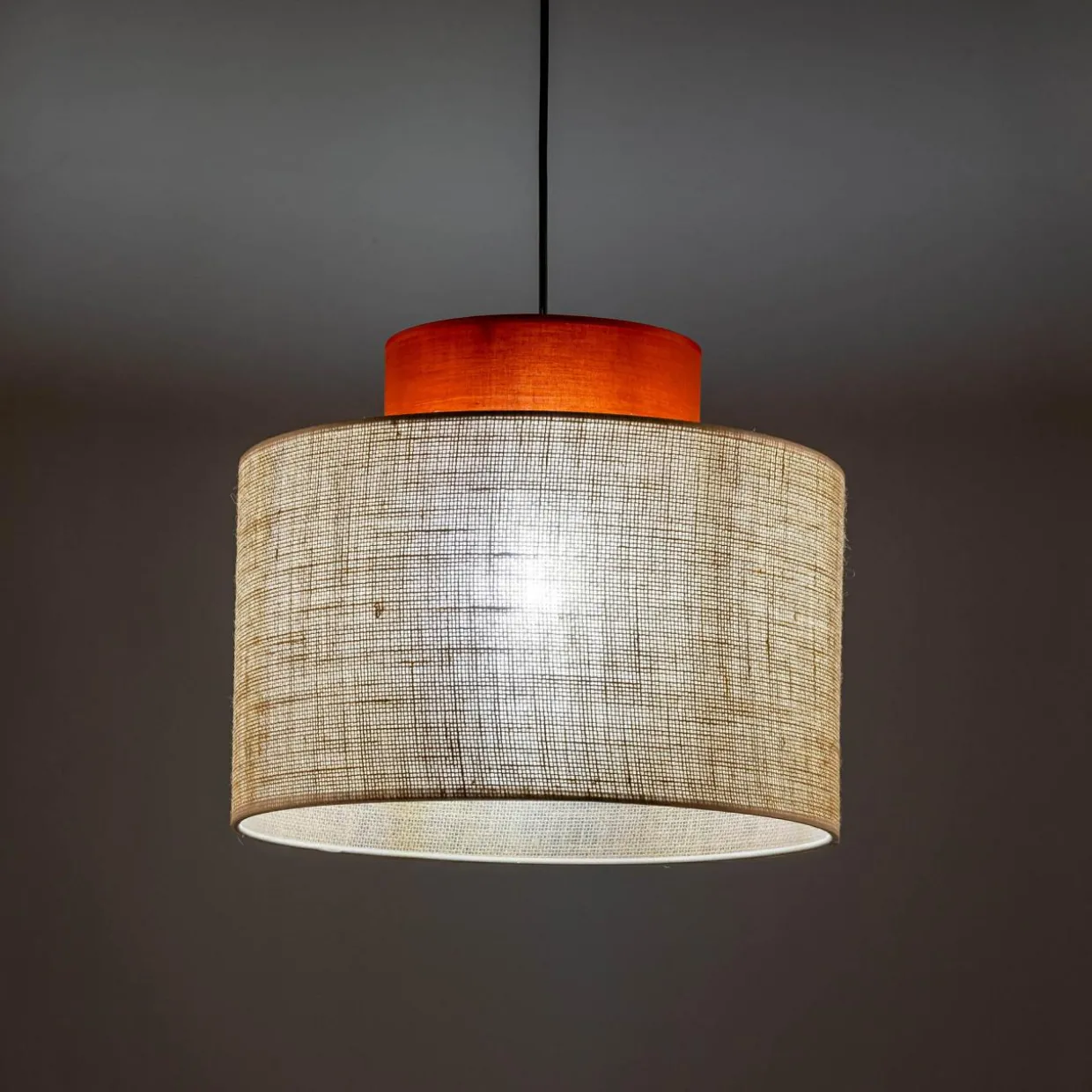 - Na szczególną uwagę zasługuje jutowy materiał, który został wykorzystany przy wykonaniu abażuru. Wprowadza on przytulny klimat, w zależności od wystroju wnętrza naturalność lub egzotykę.