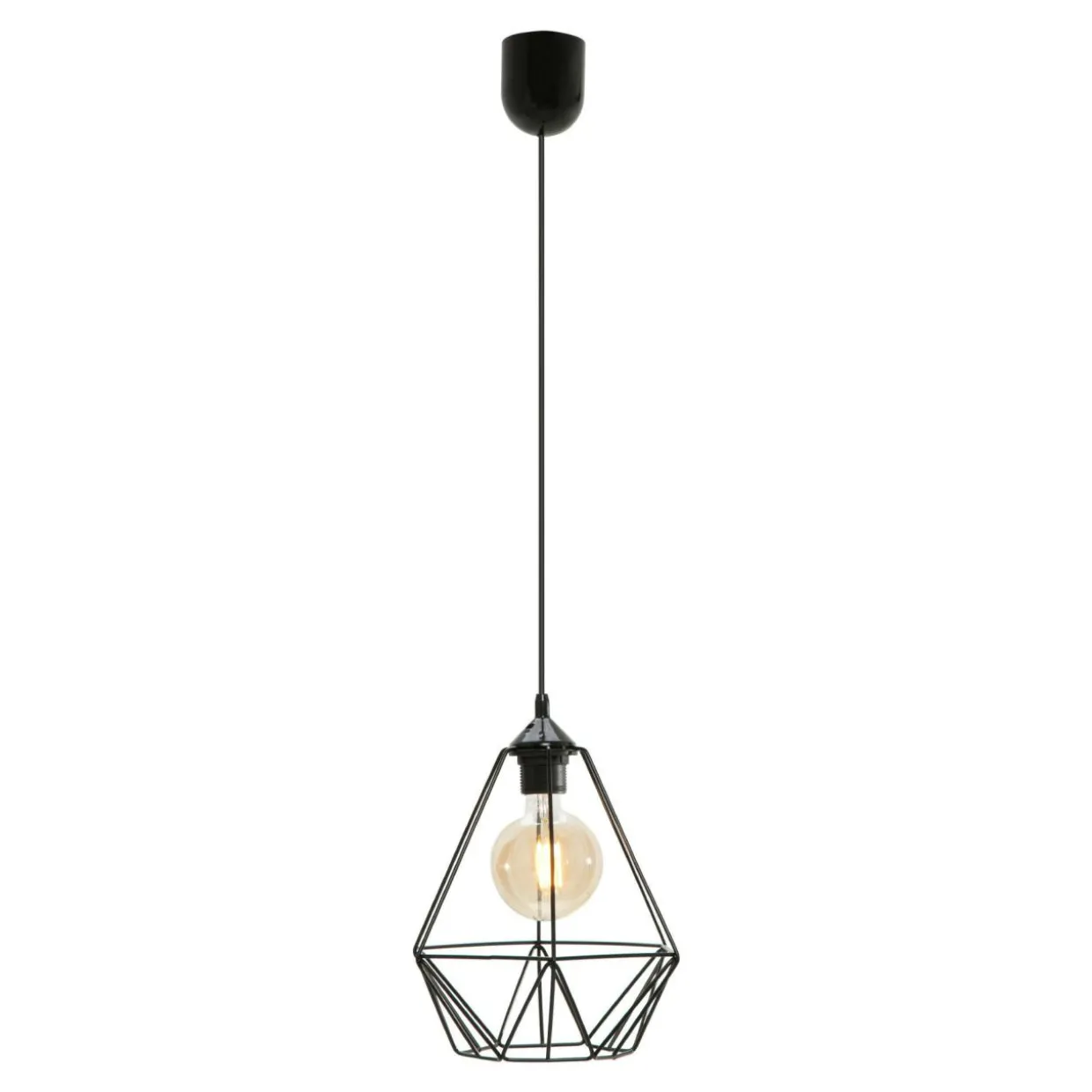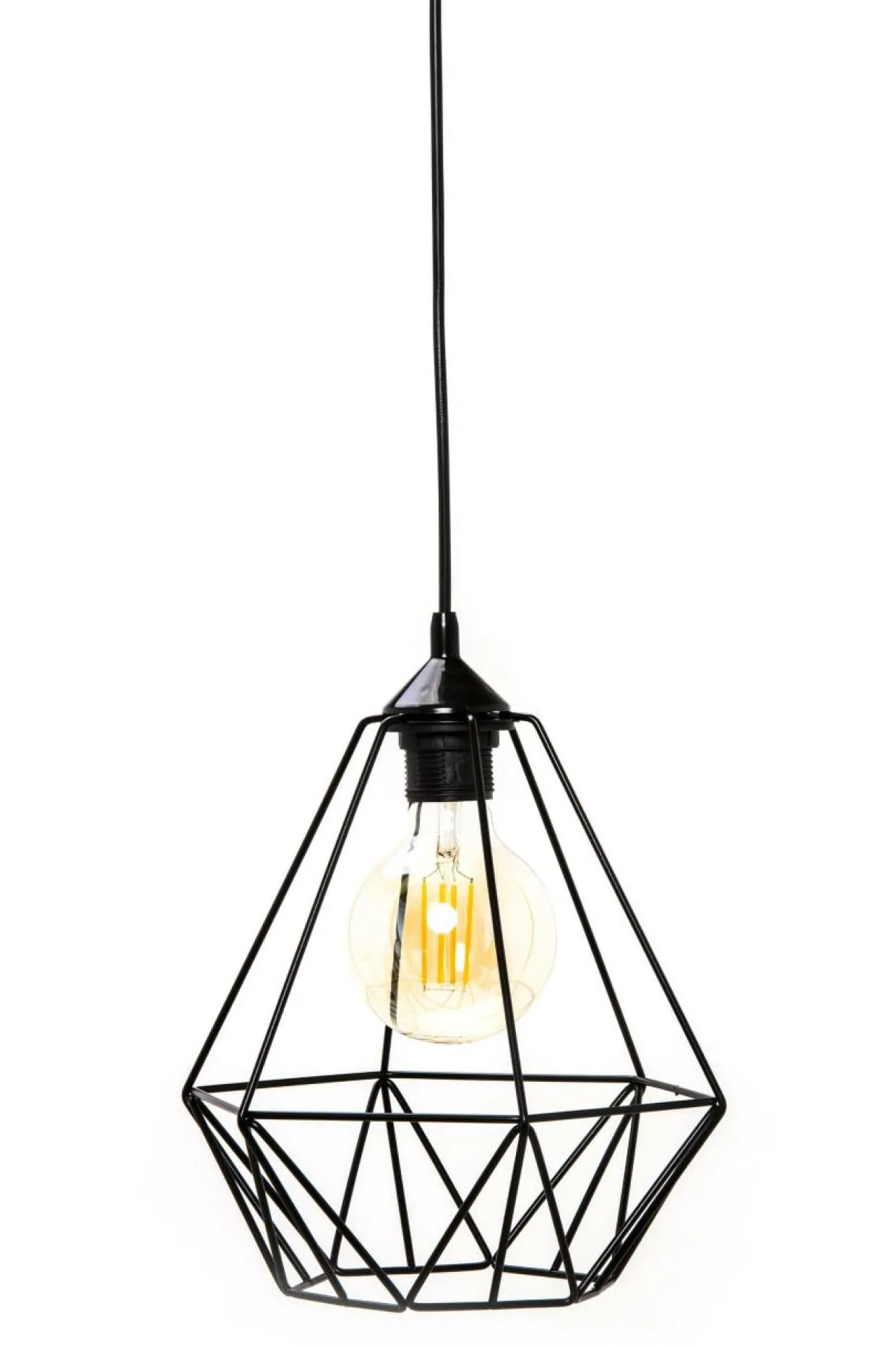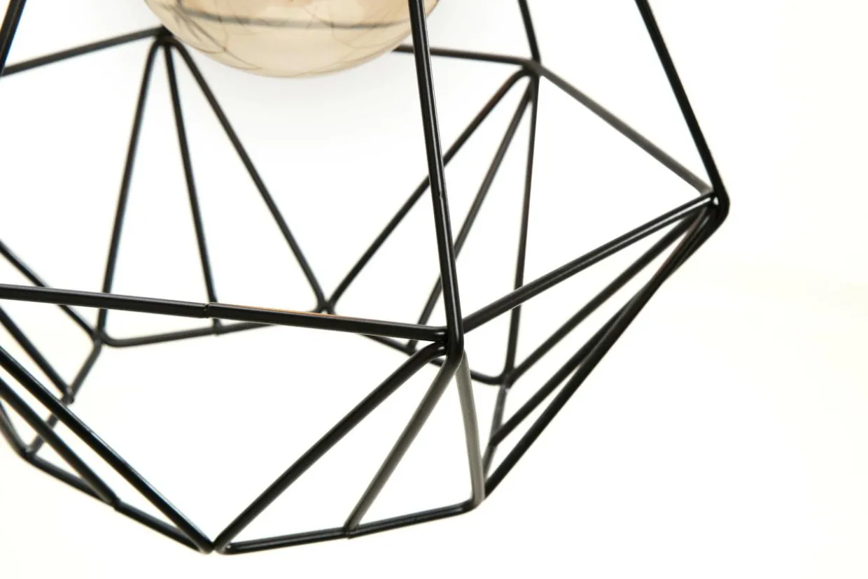 Podstawa oraz klosz lampy wykonane są z metalu z wykończeniem w czarnym kolorze. Splecione ze sobą metalowe elementy pozostawiają wnętrze doskonale widoczne, co pozwala na zastosowanie dekoracyjnych żarówek, które podkreślają walory pomieszczenia i nadają mu indywidualnego charakteru.