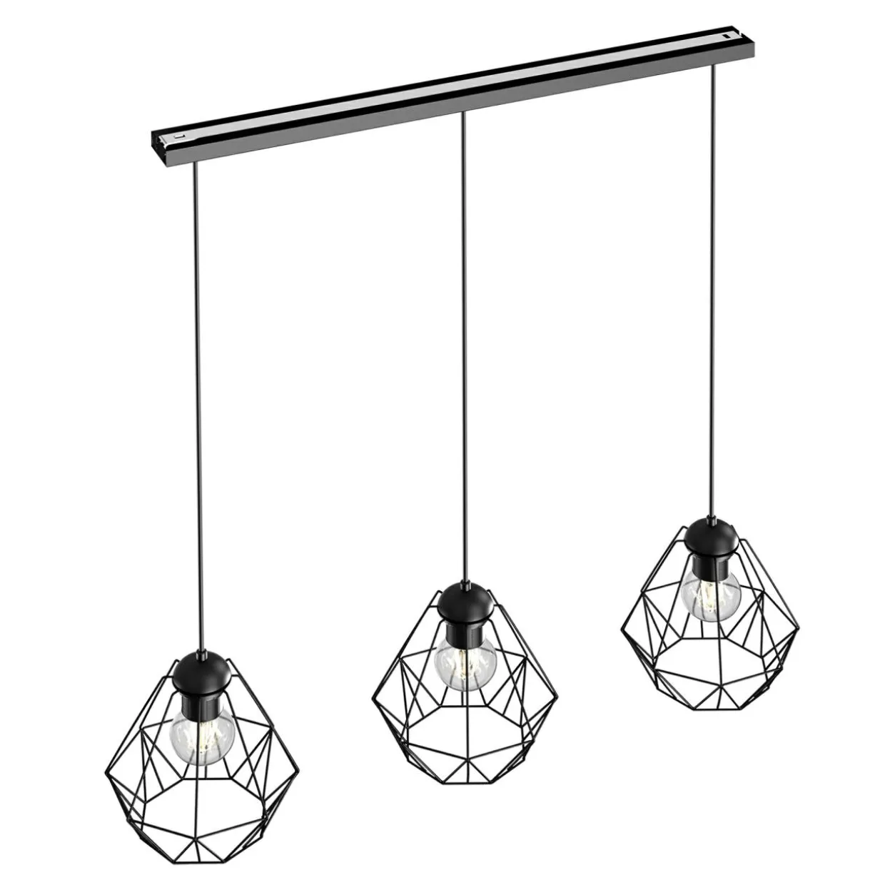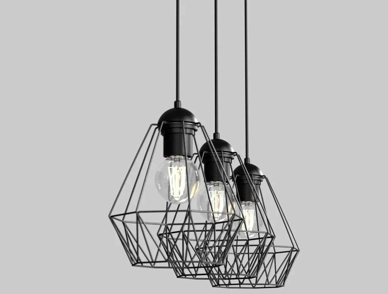 Klosze złożone ze starannie połączonych metalowych elementów tworzą geometryczną konstrukcję, która doskonale prezentuje się w połączeniu z ozdobnymi żarówkami o standardowej wielkości. Ich zamontowanie doskonale podkreśla walory pomieszczenia i nadając wnętrzu ciekawy wizualnie efekt załamywania światła. Podstawa lampy – montowana do sufitu listwa – wykonana została z metalu wykończonego czarnym kolorem.