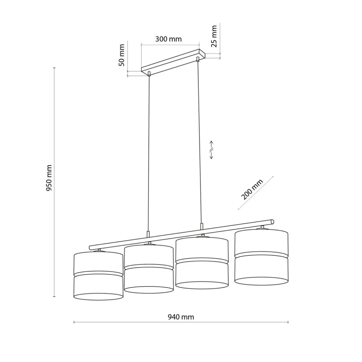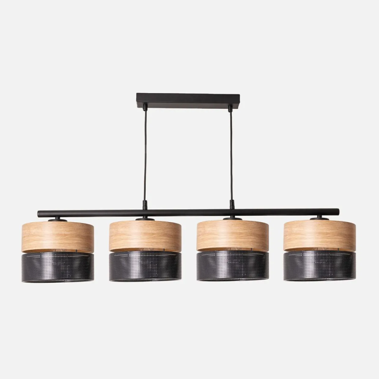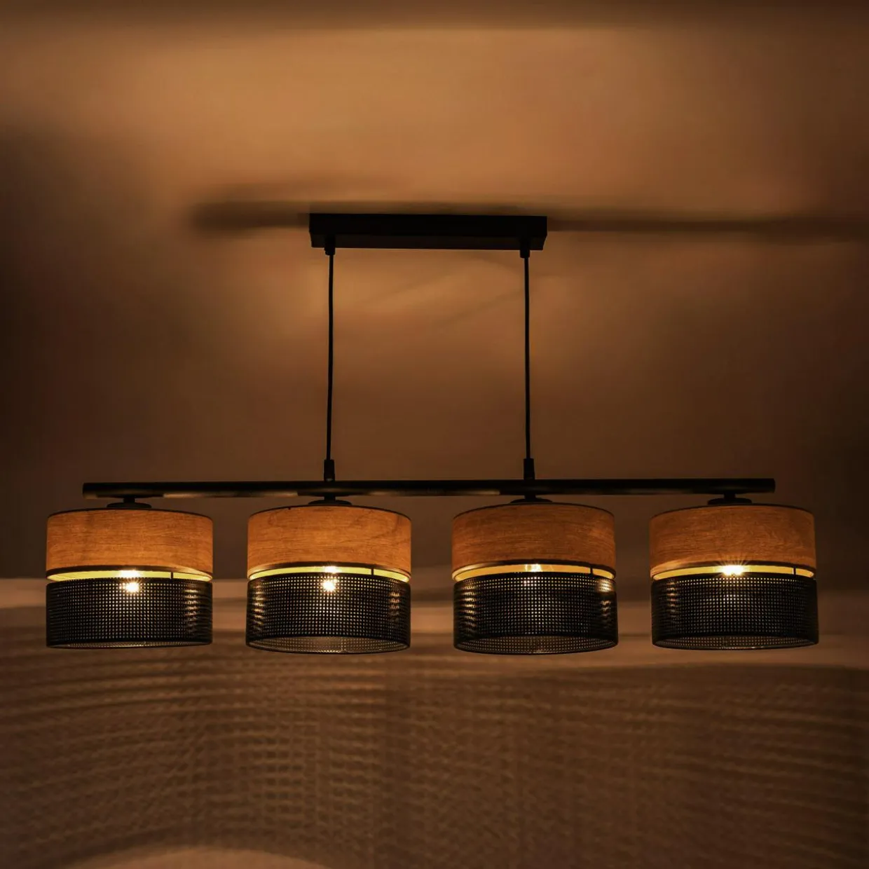 Poczwórny model lampy został zawieszony na listwie, do której przymocowane są 4 zawieszone szeregowo abażury.