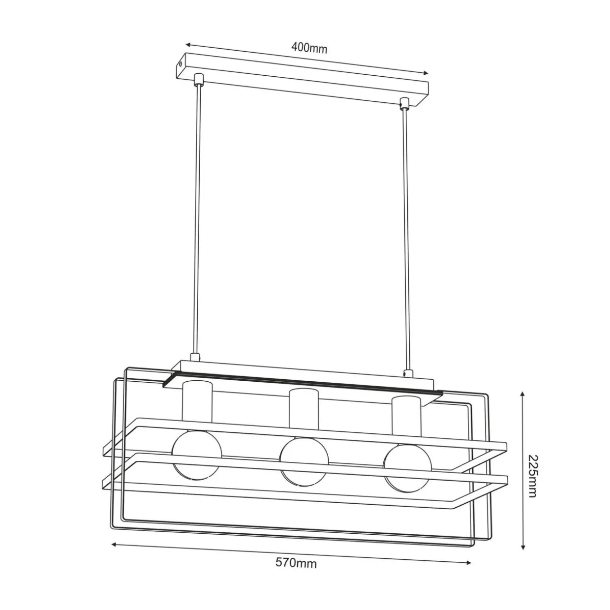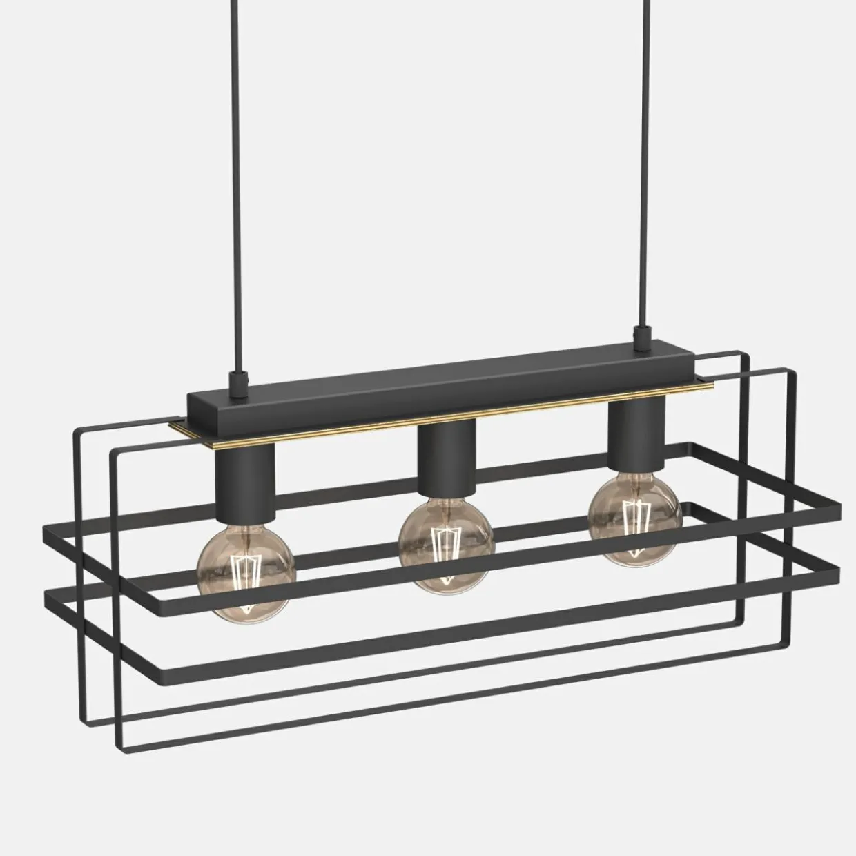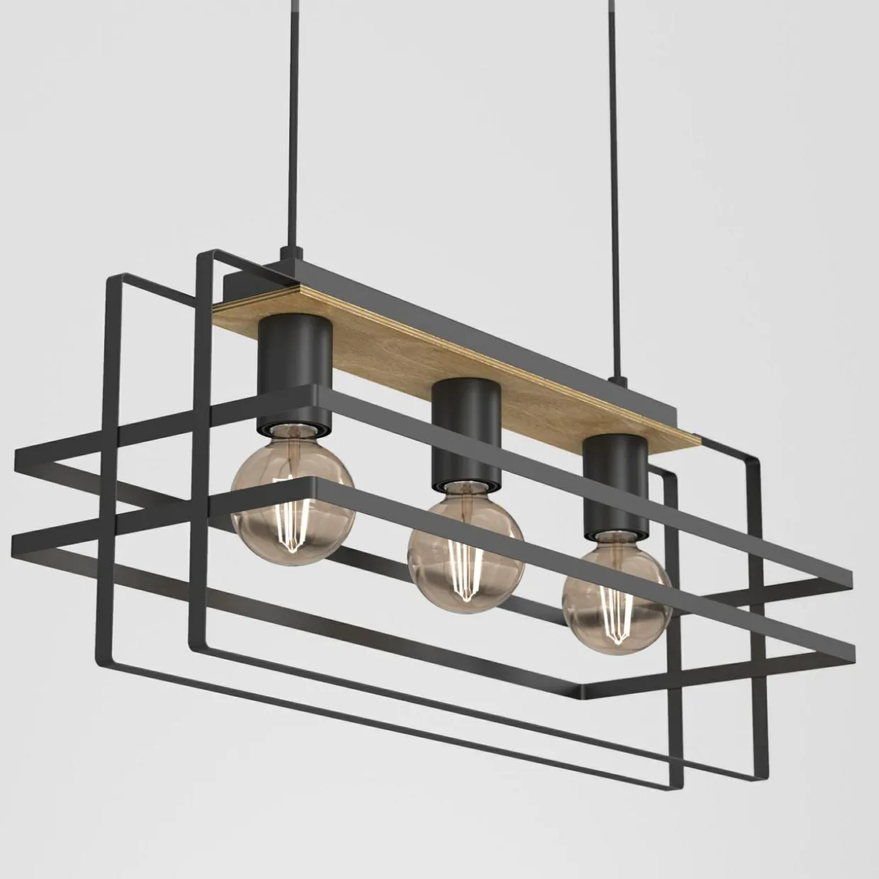 - Wiszący model potrójnej lampy KORTEZ to ciekawy design oprawy oparty na geometrycznych bryłach z widokiem na ozdobne żarówki.