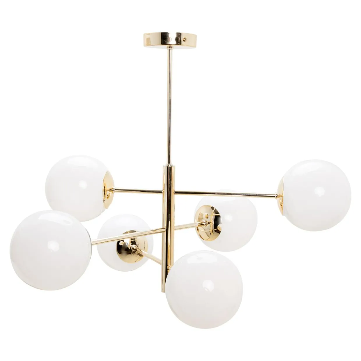 Lampa AURORA łączy elegancję, prostotę i funkcjonalność. Białe klosze, które wieńczą lampę są połączone w przejrzysty sposób. Całkowicie osłaniają żarówki, a wykończenie bazy lampy w złotym kolorze nadaje całości ciepła i doskonale koresponduje z meblami w odcieniach drewna, brązu, czerni i bieli.