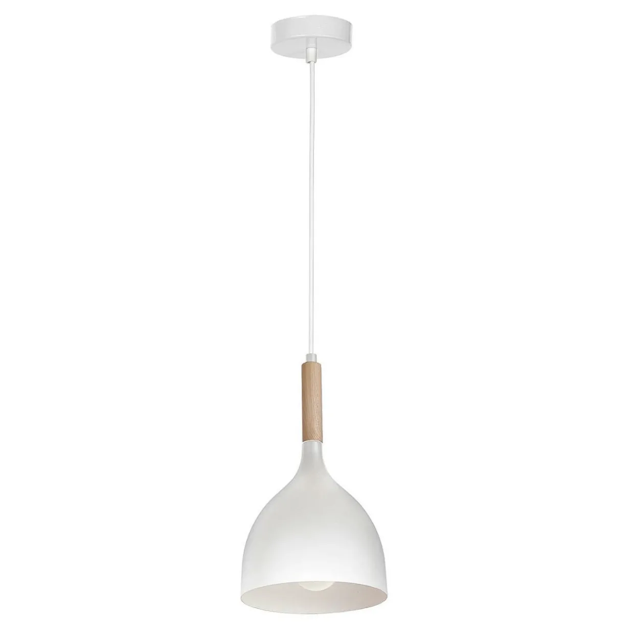 Biały klosz w kształcie dzwonu opatrzony dekoracją z jasnego drewna doskonale komponuje się z meblami utrzymanymi w nowoczesnym stylu.