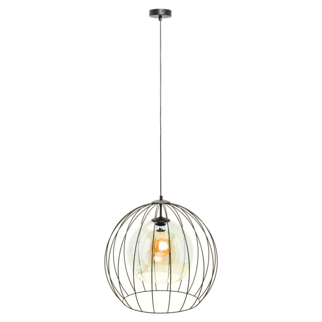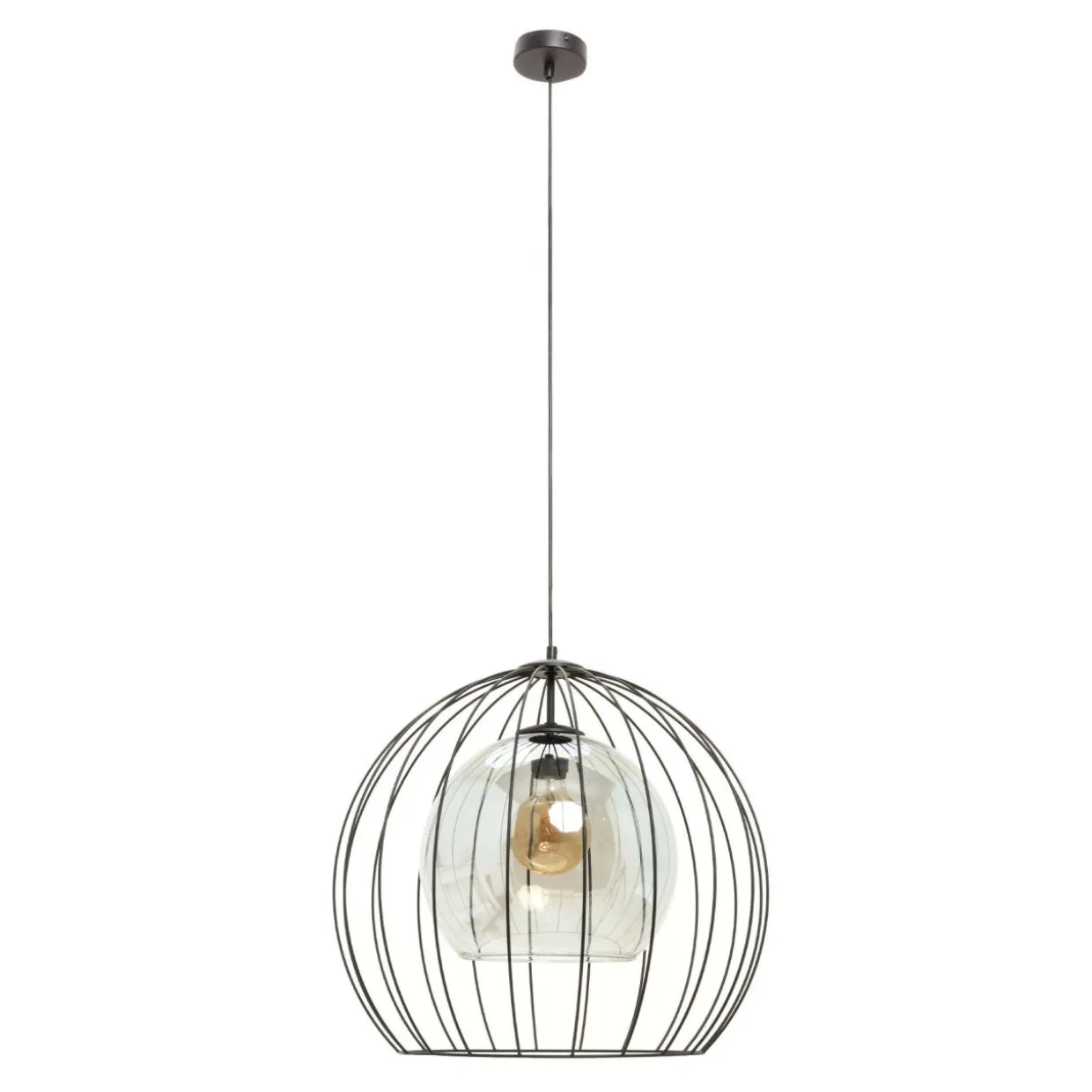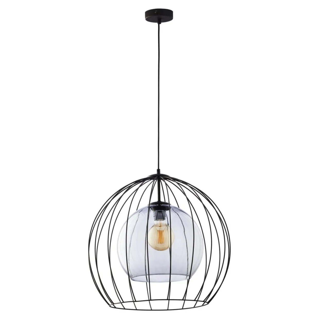 Czarne wykończenie klosza i podsufitki w ciekawy sposób kontrastuje z transparentnym szkłem klosza lampy, który pozwala na eksperyment z kształtem oraz kolorem żarówki oraz emitowanego przez nią światła.