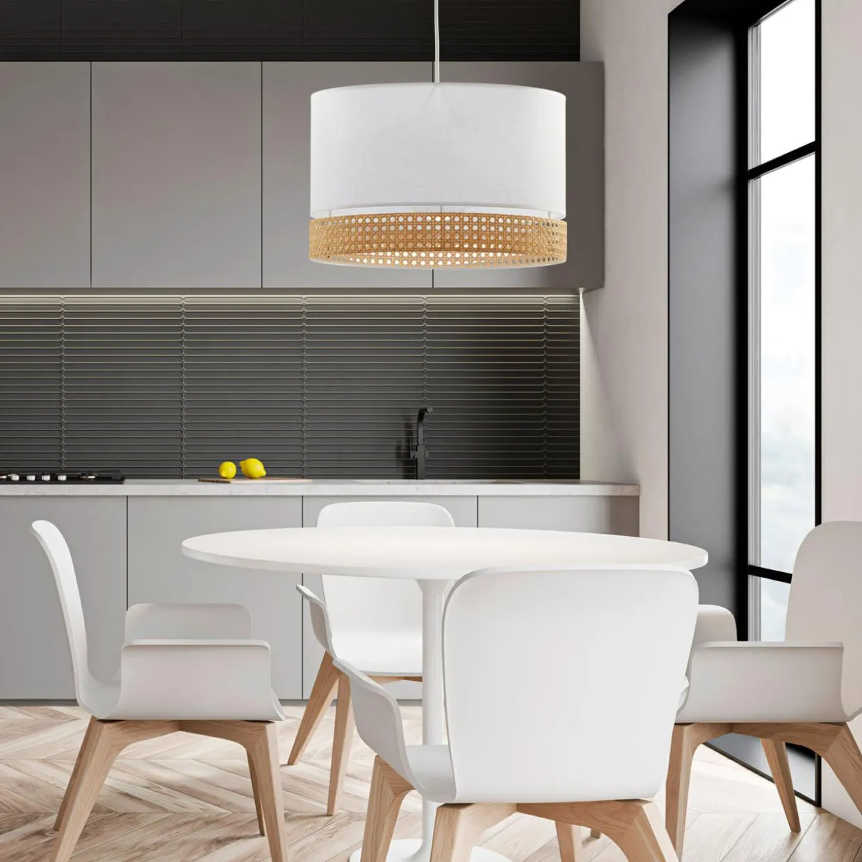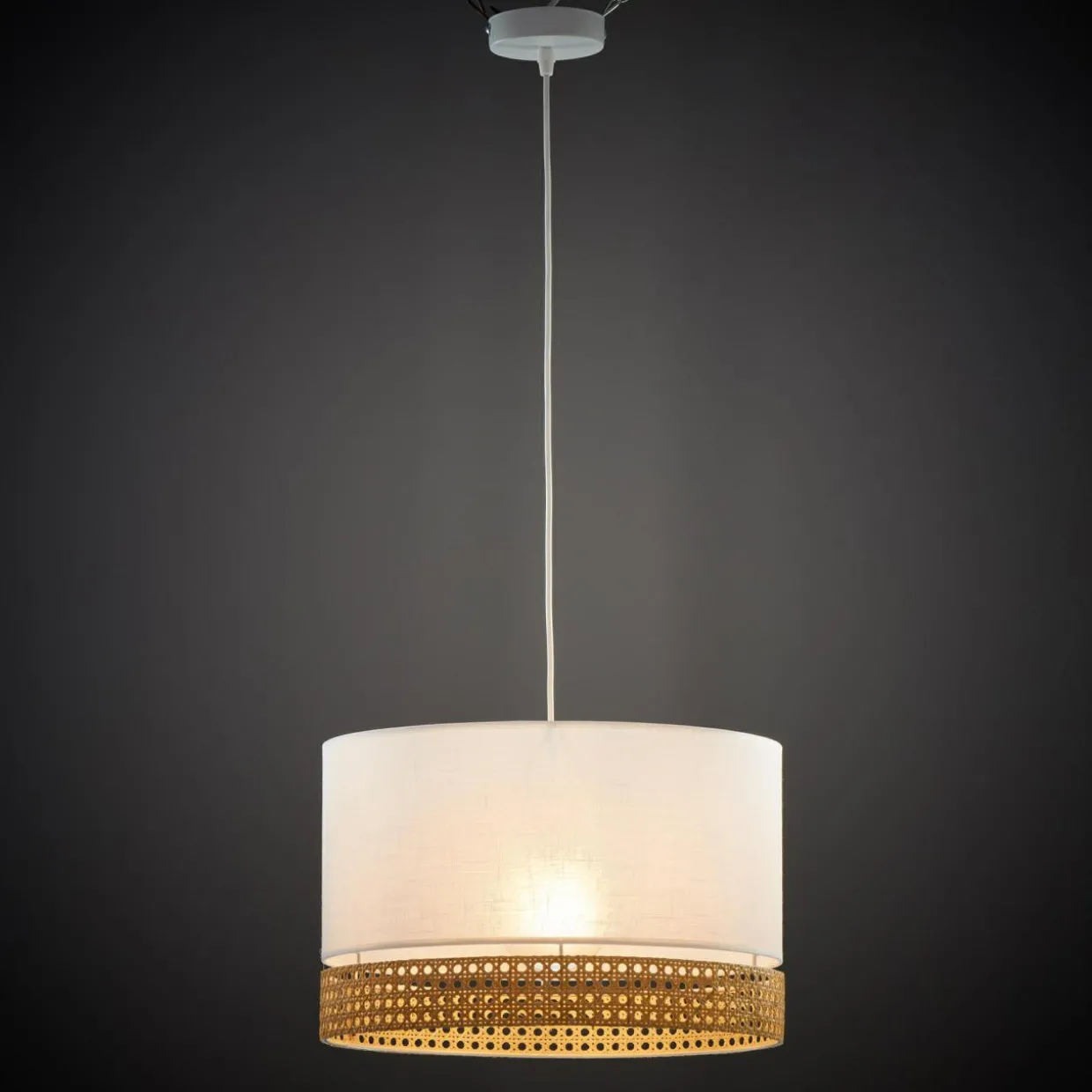 Nadaje wnętrzu egzotyki, a zestawiona z wiklinowymi, bambusowymi lub rattanowymi meblami podkreśla naturalne elementy otoczenia. Abażur lampy składa się z dwóch części. Górna została wykończona tkaniną w białym kolorze, natomiast dolna to rattanowa plecionka.