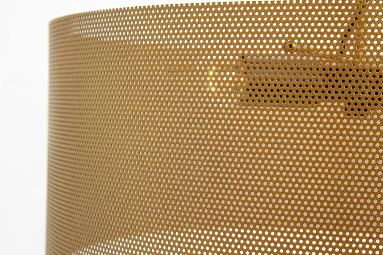 Ażurowy klosz lampy podłogowej GALAXY zwraca uwagę oryginalnym wzorem – przypomina plaster miodu. Siateczka w złotym kolorze osłania żarówkę, jednocześnie pozwalając dojrzeć jej kształt.