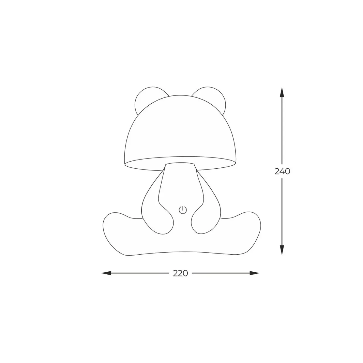 Lampa ma półokrągłe uszy misia i klosz w kształcie kopuły. Oświetlenie LED jest wbudowane w jej dolną część.