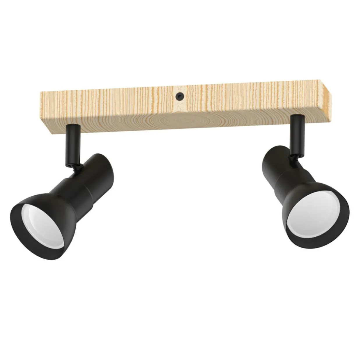 Podstawę lampy wykonano z jasnego drewna o widocznym usłojeniu, a głowice z metalu wykończonego czarnym, matowym kolorem.