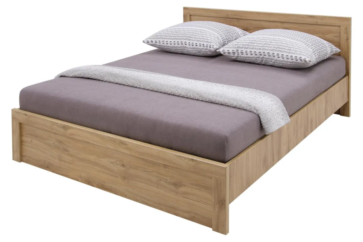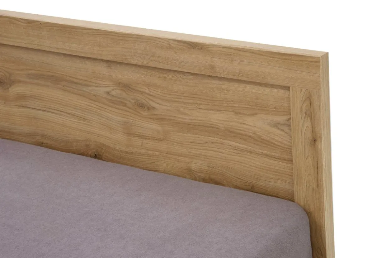 - Korpus i rama łóżka wykonane są z płyty meblowej w kolorze jasnego drewna.