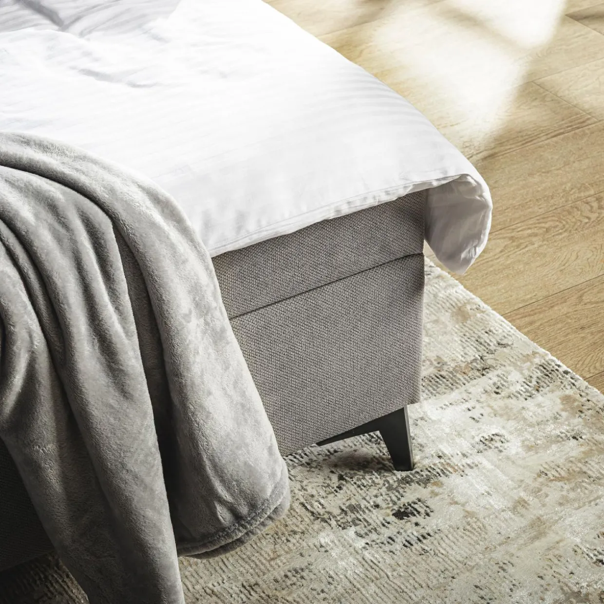 Jasnoszara tkanina, którą pokryto łóżko kontynentalne MARY wprowadzi do wnętrza kojącą atmosferę, która pozwoli Ci na głęboki oddech po zabieganym dniu.