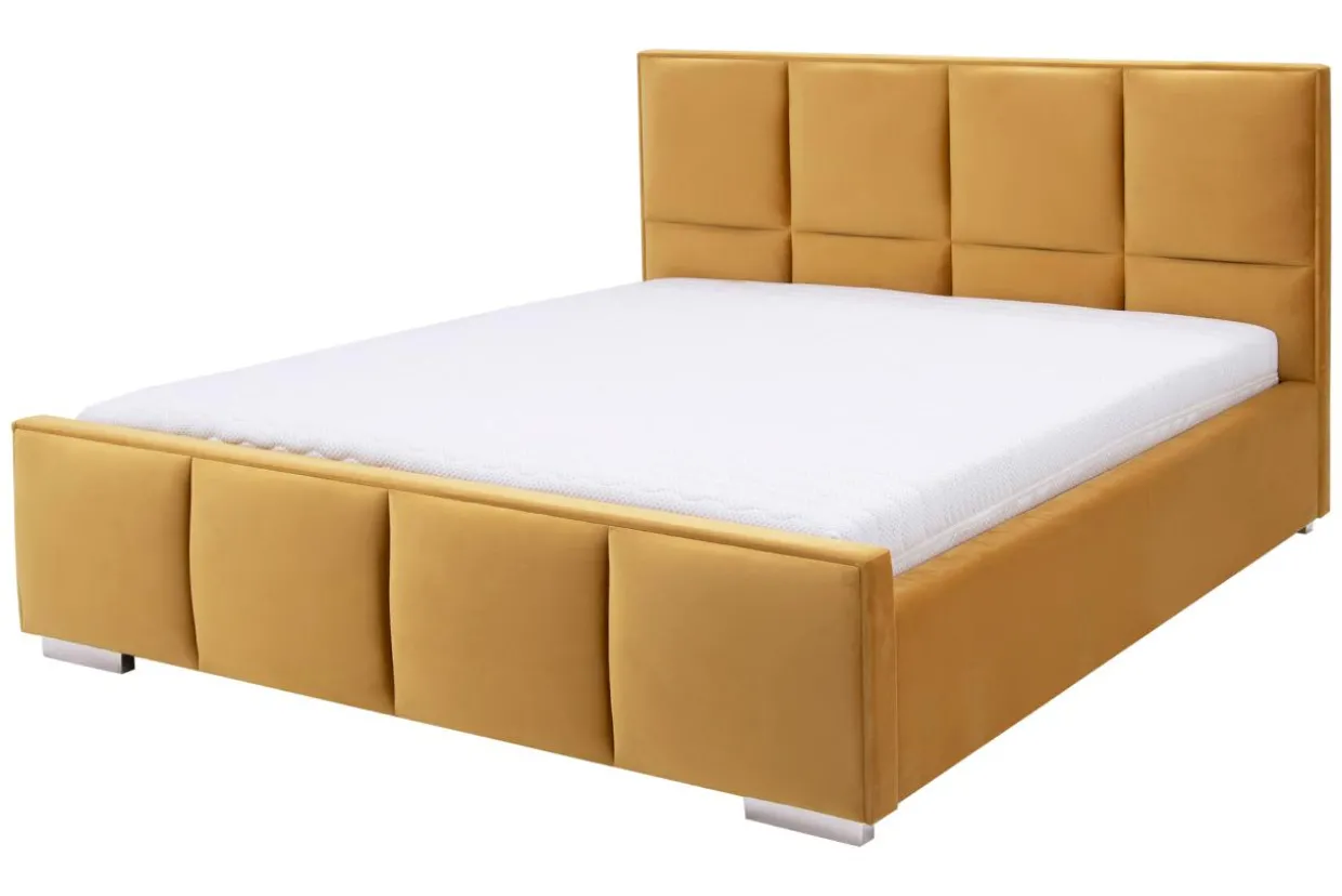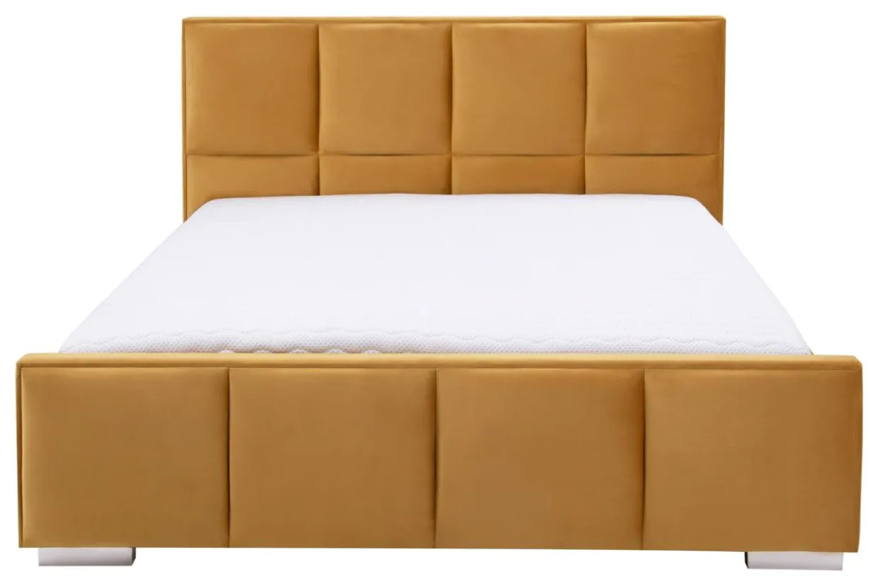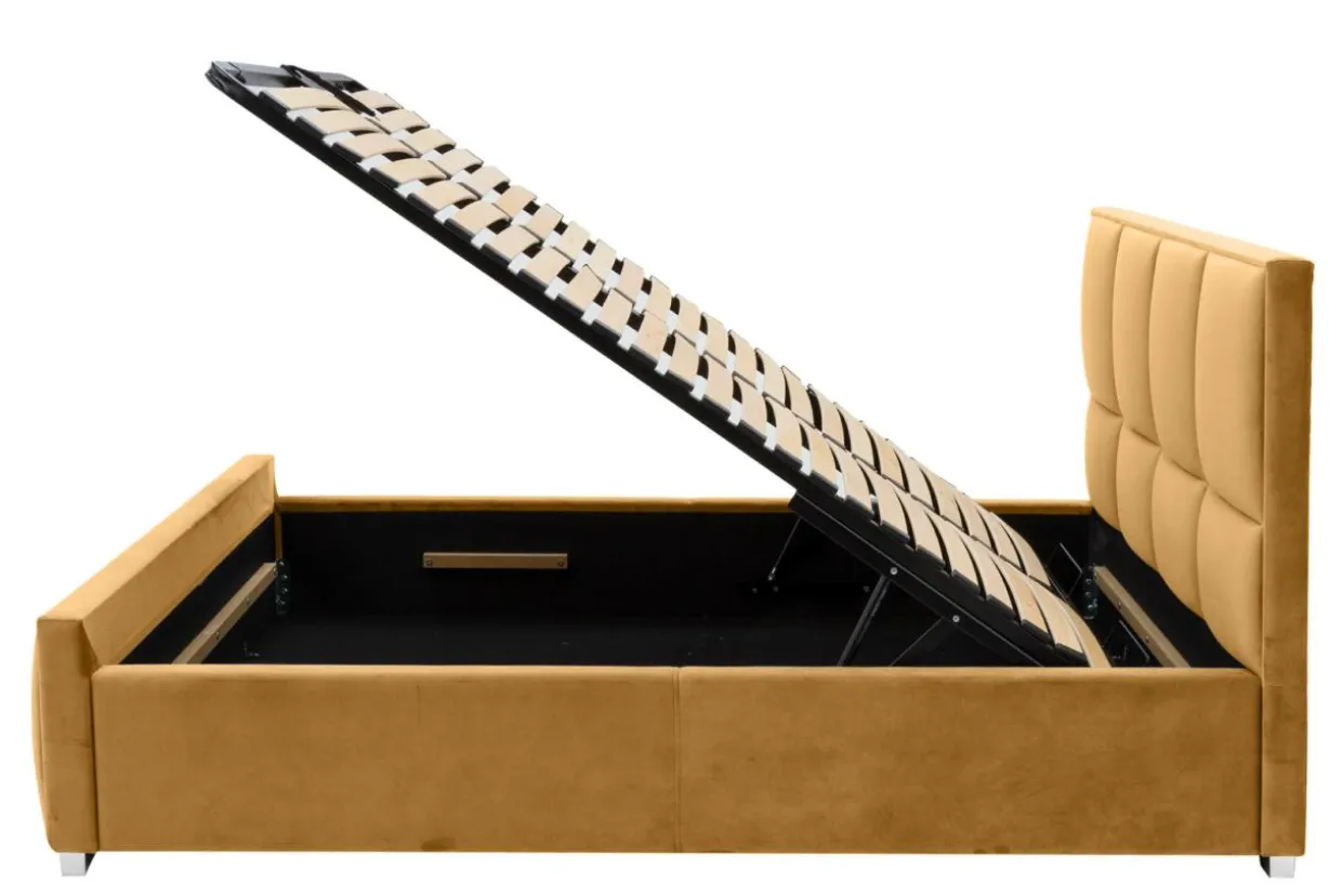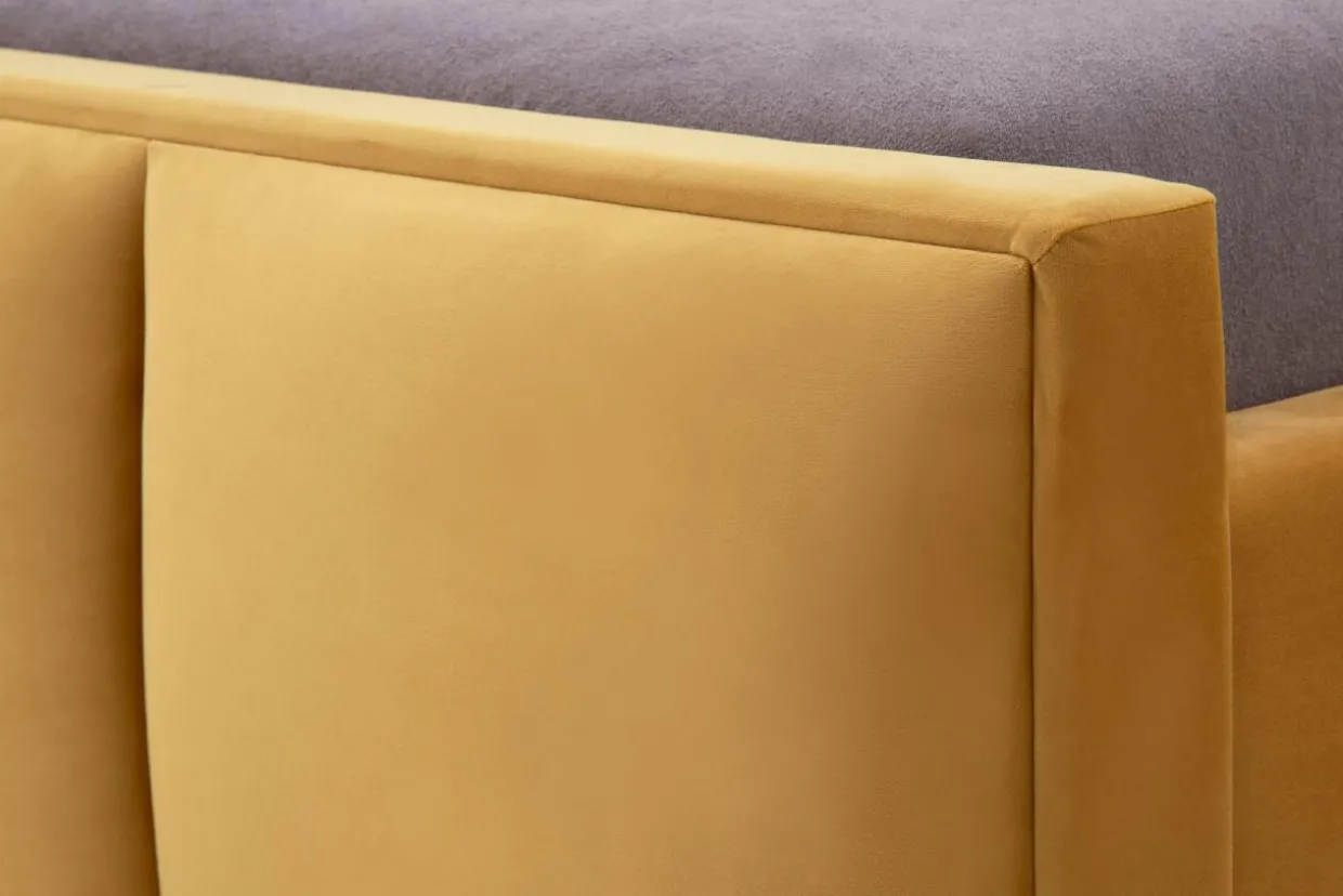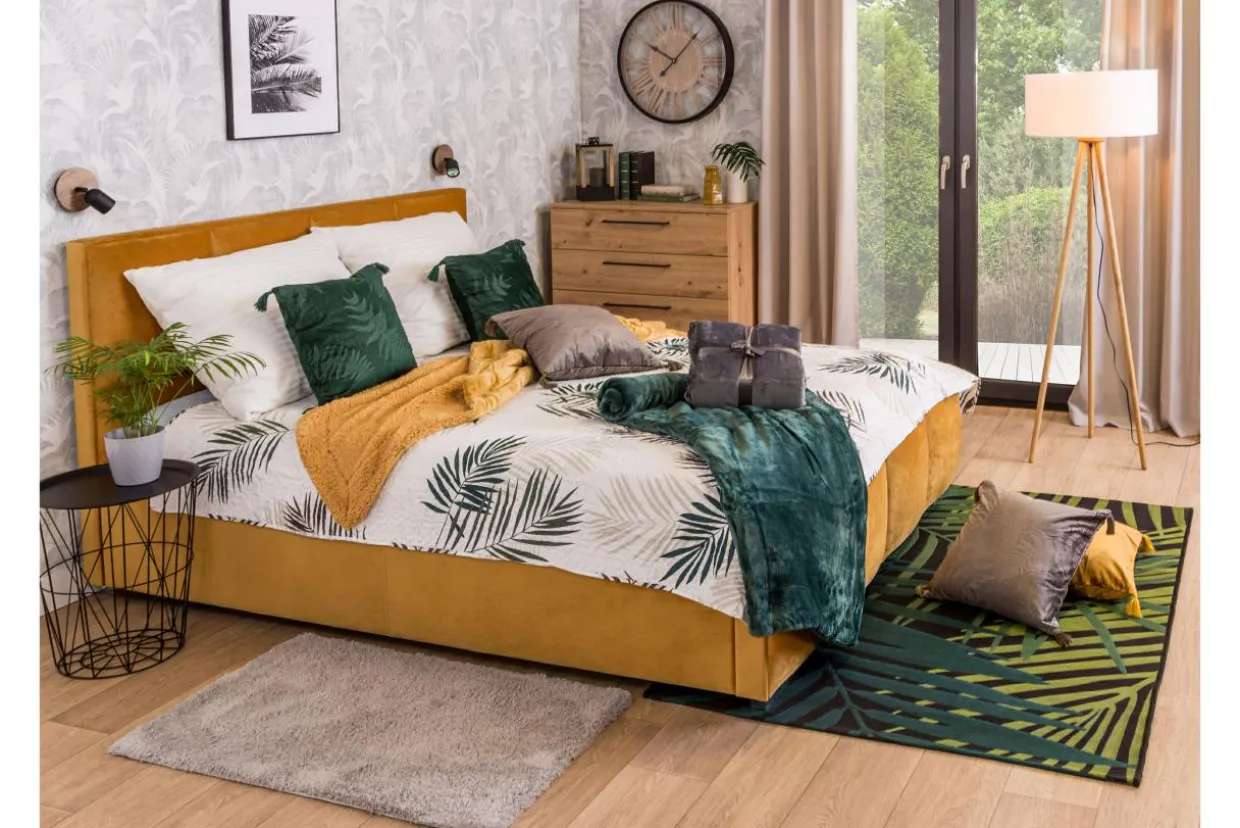 - Łóżko w musztardowym kolorze idealnie wpasuje się we wnętrza urządzone w ciepłych odcieniach: brązu i złota.