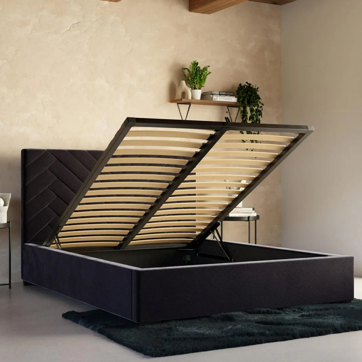 - Pojemnik pod stelażem da Ci przestrzeń, w której przechowasz pościel i inne domowe tekstylia. Dostęp do niego ułatwi Ci podnośnik gazowy.