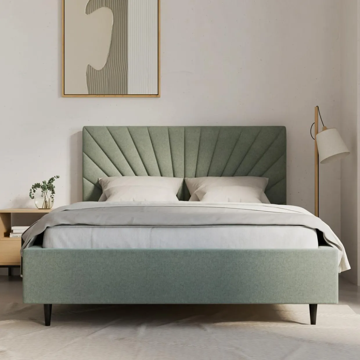 - Łóżko jest wyposażone w tapicerowaną ramę oraz stelaż, które stworzą komfortową powierzchnię spania dla 2 osób.