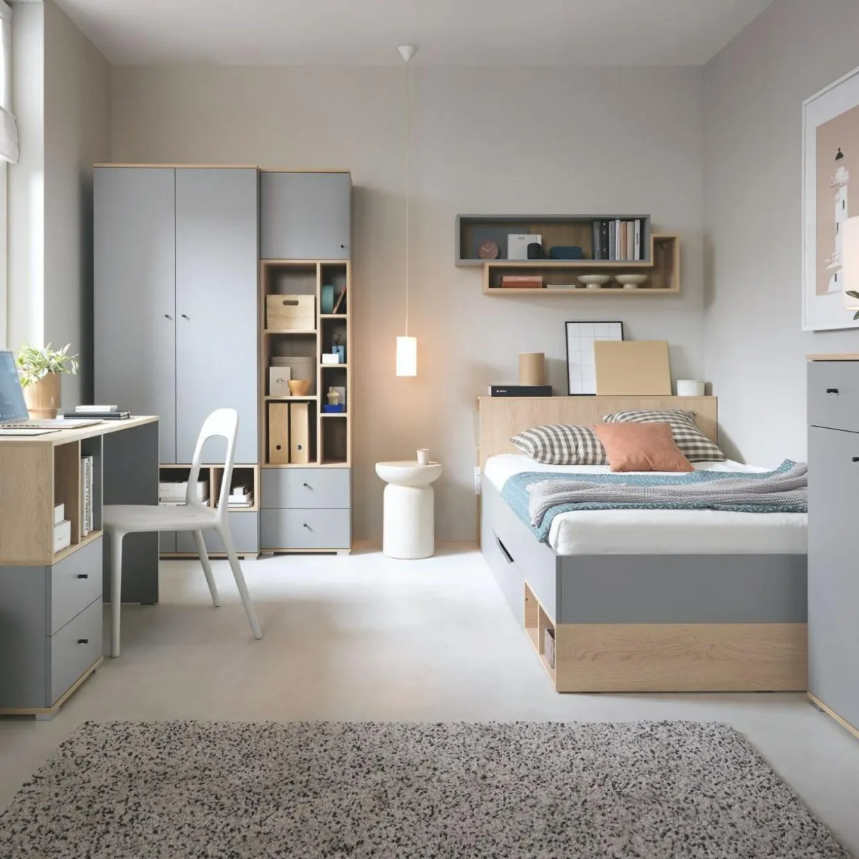 - Połączenie dębu biszkoptowego z szarym platynowym zachowuje harmonię w pokoju, zachęcając do spędzania czasu we własnym pokoju.